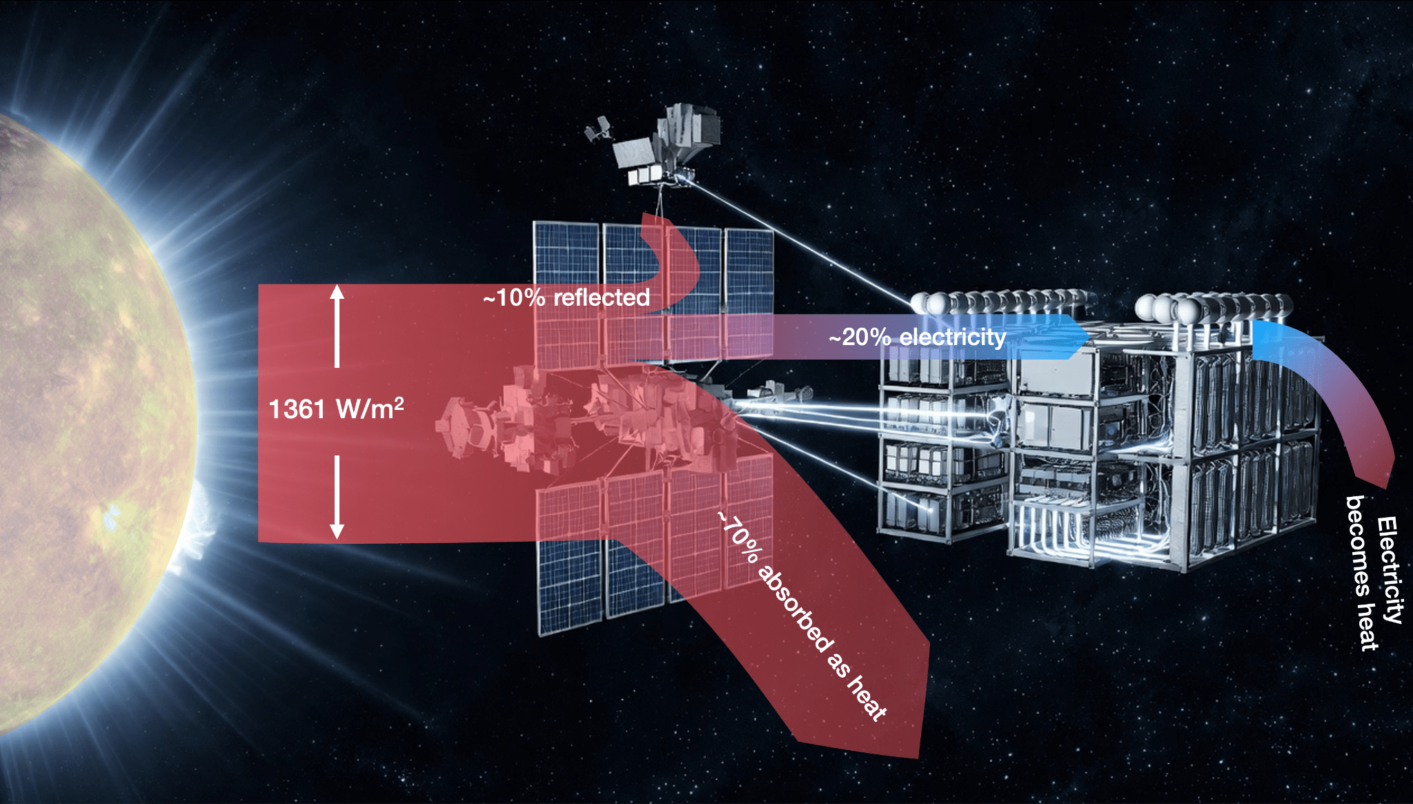 The way the datacenters work is that the solar panels get the energy from the Sun—about 1,361 W/m2. They reflect a bit less than 10% of that, so let’s say they absorb 1,225 W/m2. They convert about 20% into electricity (so ~272 W/m2) and the rest becomes heat. The electricity is sent to the GPUs, and in the process, that electricity becomes heat, too. The heat of the solar panels and GPUs must then be dissipated through radiators.