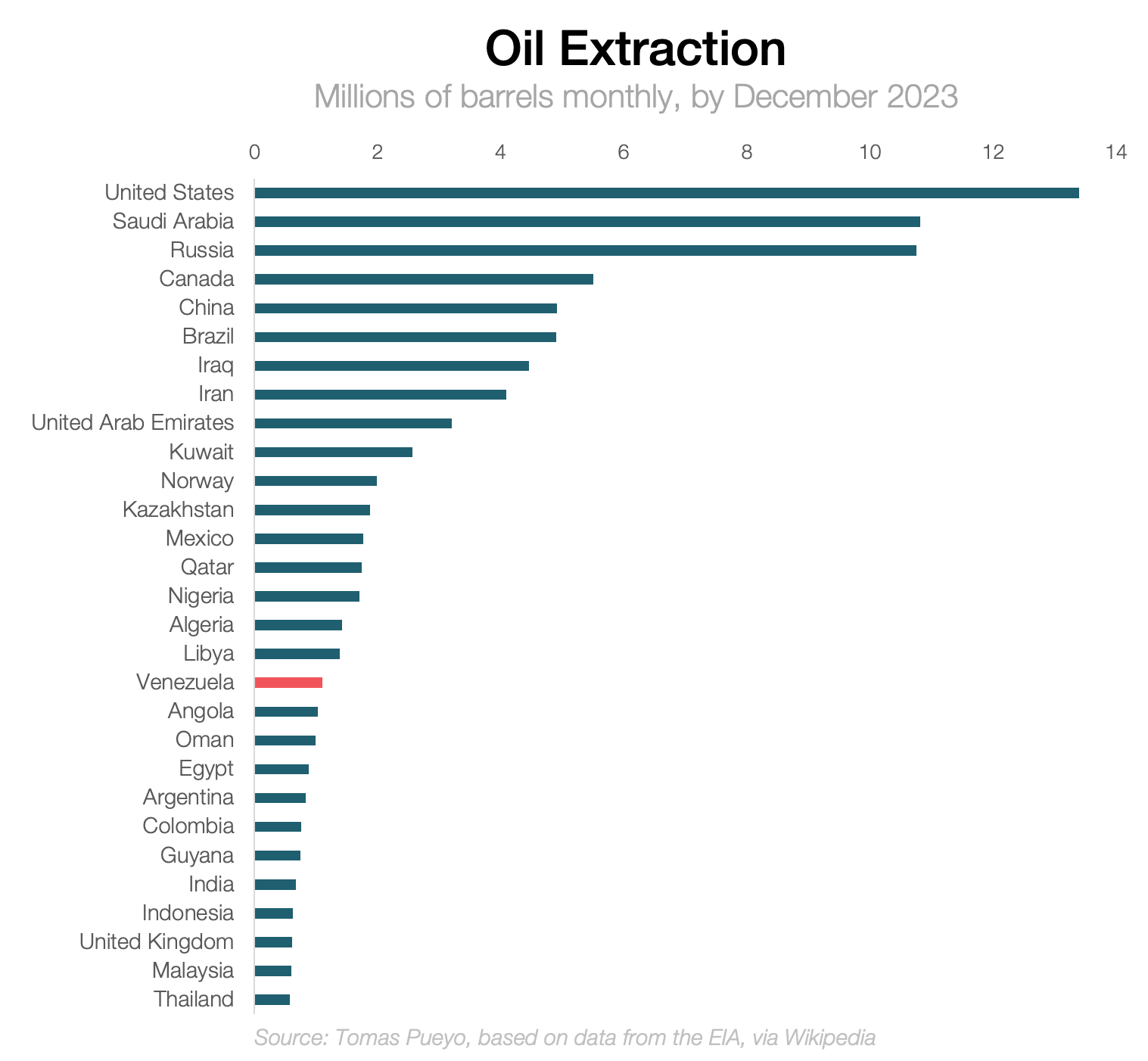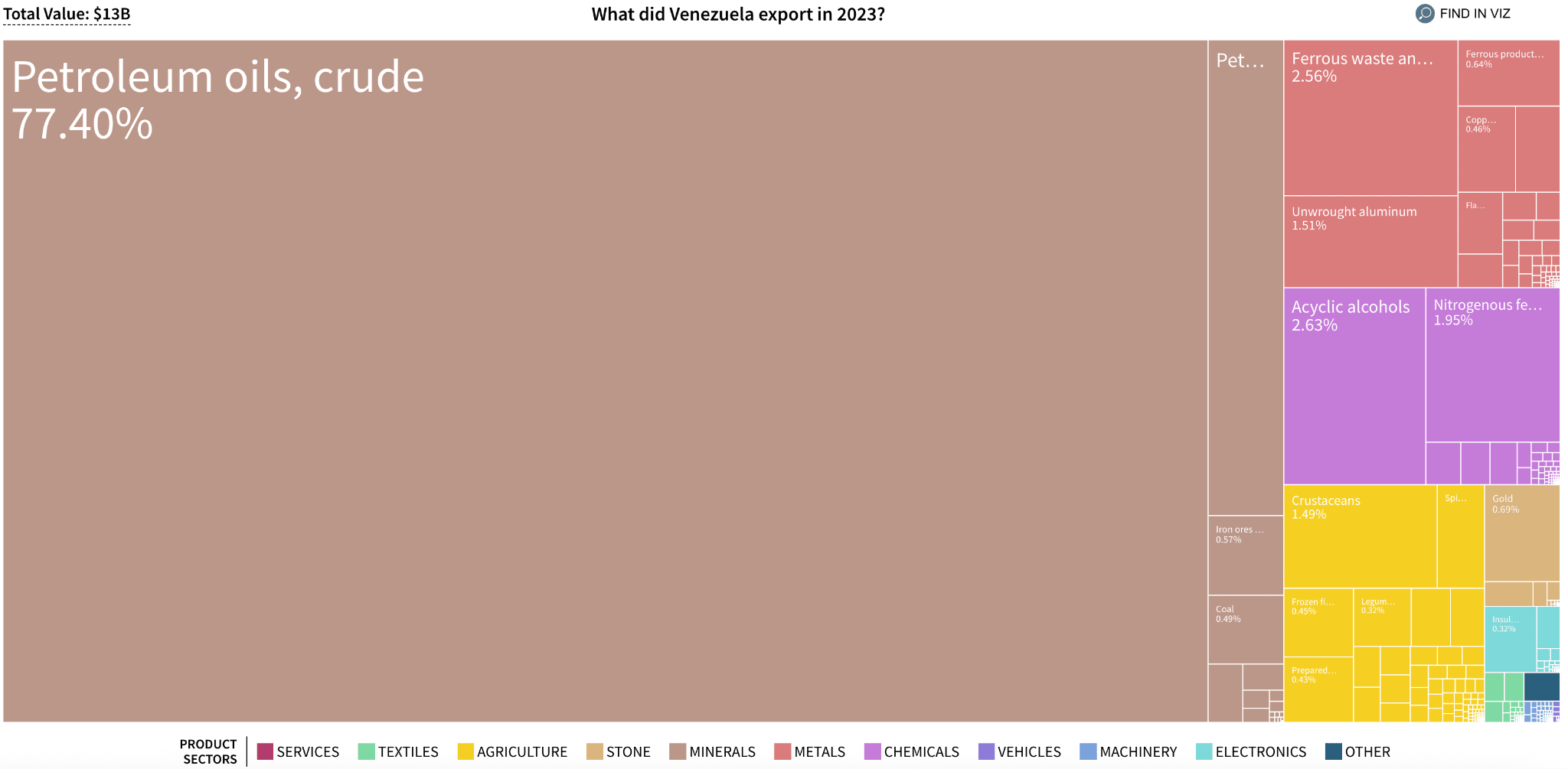 And Venezuela is extremely dependent on oil. In 2023, over 80% of its exports were oil and its derivatives:
