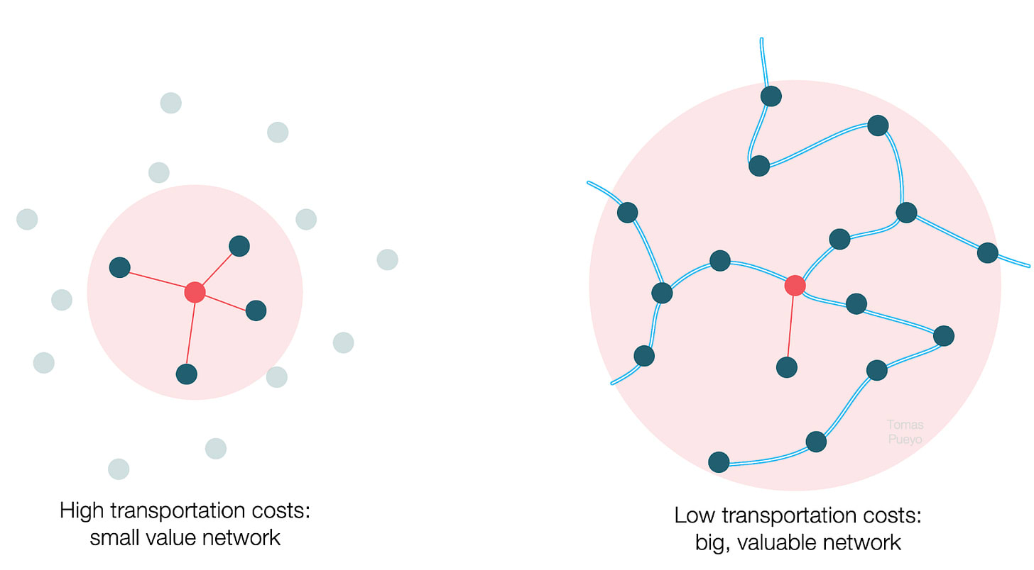 All in all, the value of the network to the right is at least an order of magnitude higher than that to the left! The cheaper the transport, the more trade at a lower cost, the more wealth generated, the more that wealth can be reinvested in better canals and bridges and roads, and the area’s wealth grows even further.