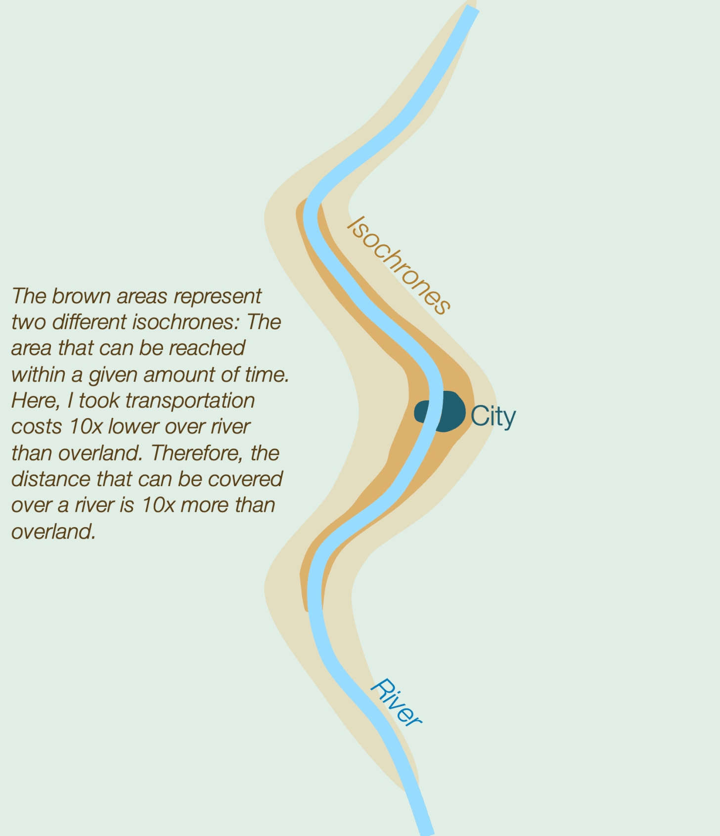 This is what rivers do: By dropping the cost of transport, they connect huge numbers of cities, which can trade much more between them, become wealthier, their population can buy even more, and so on and so forth.