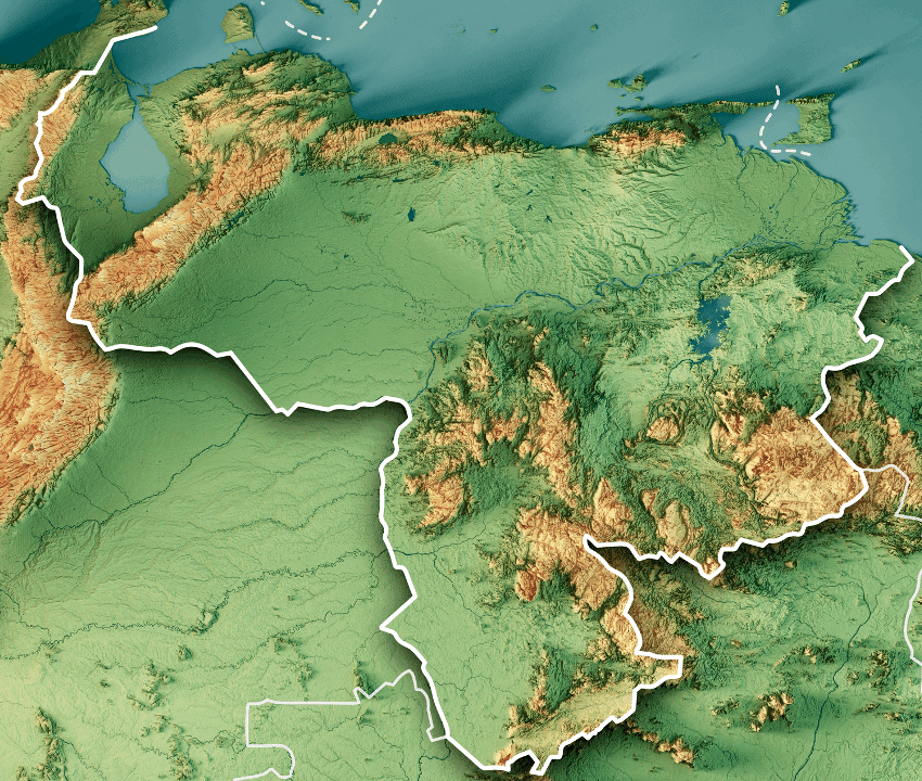 The savanna in the middle is the Orinoco River Valley, what Venezuelans call the Llanos.