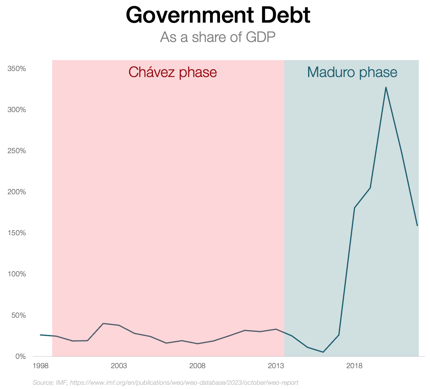 But note also how other exports shrank even more, due to the resource curse: They were crowded out by bad political management and the weight of the oil economy. You can nearly tell the entire history of Venezuela’s socialist authoritarian experiment with these four charts: