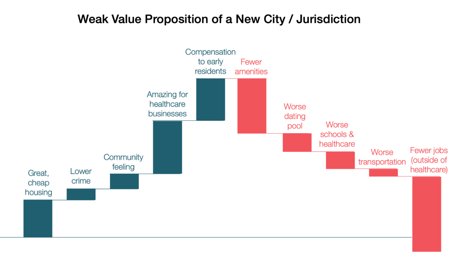The more remote and novel the city is, the more these assets or liabilities will stand out from existing cities, creating a starkly differentiated product. But the big thing they’ll be fighting is the lack of network effects. The best way to solve this problem is bypassing the early stage (e.g., satellite cities, anchor tenants). If they can’t do that, though, the best strategy is to invest heavily in the other aspects: cheap, great housing, less crime, a community feeling, jobs in some vertical, and compensation for early residents, while they try to mitigate the other issues as much as possible, with schools, sites with good nearby airports, clinics, and the like.