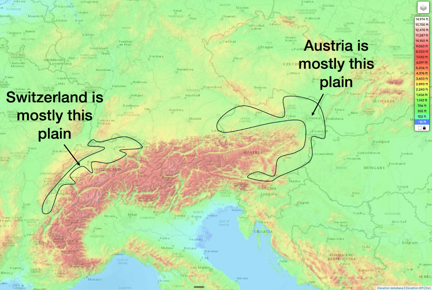 Austria’s rich region is in the plains. Vienna has an altitude of ~200 m / 600 ft and is on the Danube, one of the best navigable waterways in the world.