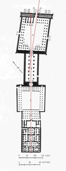 Axial architecture is meant to wow you as you arrive and follow the line towards the entrance. These structures tend to be organized along cosmic lines, like cardinal directions, solstices, etc.