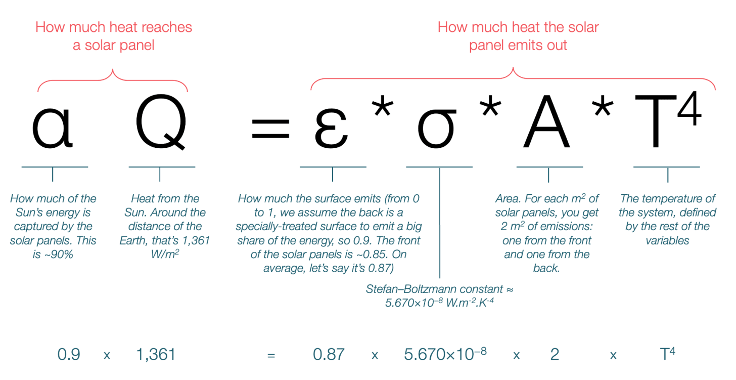 The actual formula is ε*σ*A*T4, but it’s pretty simple. The first variable (ε) is how good your surface is at emitting heat. A good radiator will be close to 1. The second (σ) is just a constant. The third (A) is the area, but we’re going to look at this per square meter of solar panels, so it’s 1, too. The last item, Temperature, is the one that matters. For a given area that is efficient at emitting heat, it’s the only component that has a massive impact.