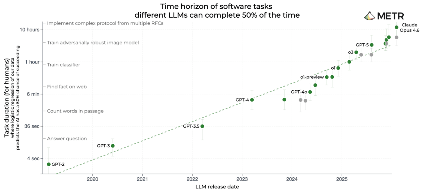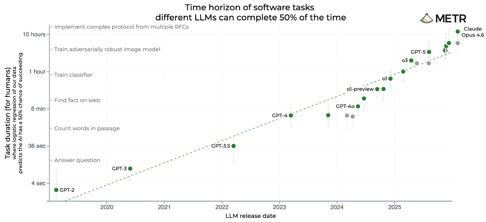 Claude Opus 4.6 was released in February by Anthropic. METR estimates it can complete tasks that would take a human programmer 12 hours.