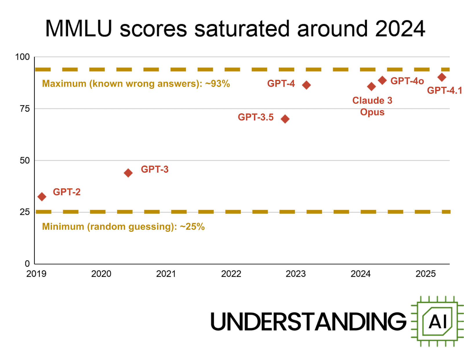 In the last year, AI companies have stopped reporting MMLU scores — presumably because scores have stopped improving. That’s not surprising; it’s impossible to get a score much higher than 93% without cheating because around 6.5% of MMLU questions contain errors.