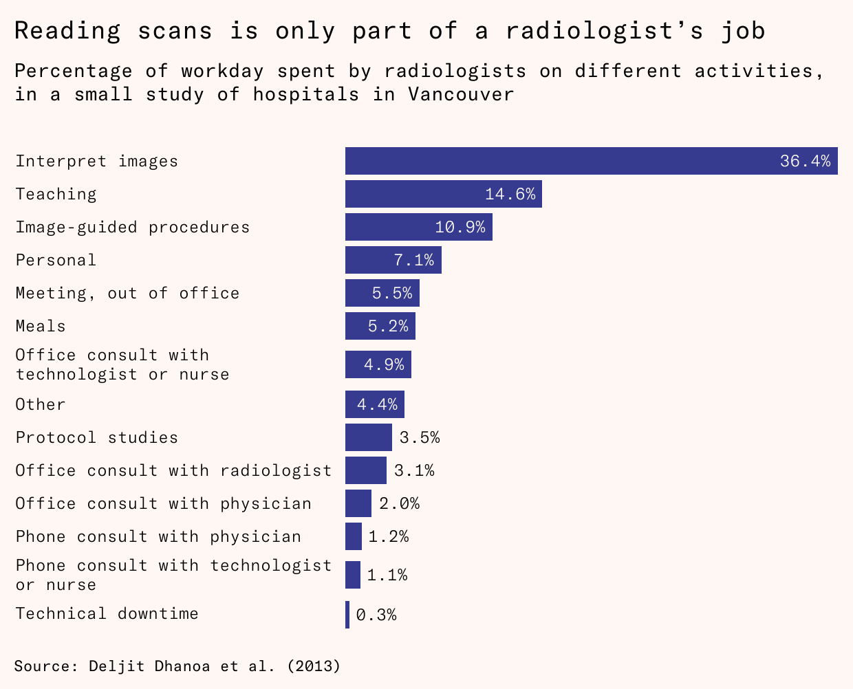 Radiologists are useful for more than reading scans; a study that followed staff radiologists in three different hospitals in 2012 found that only 36 percent of their time was dedicated to direct image interpretation. More time is spent on overseeing imaging examinations, communicating results and recommendations to the treating clinicians and occasionally directly to patients, teaching radiology residents and technologists who conduct the scans, and reviewing imaging orders and changing scanning protocols.4 This means that, if AI were to get better at interpreting scans, radiologists may simply shift their time toward other tasks. This would reduce the substitution effect of AI.
