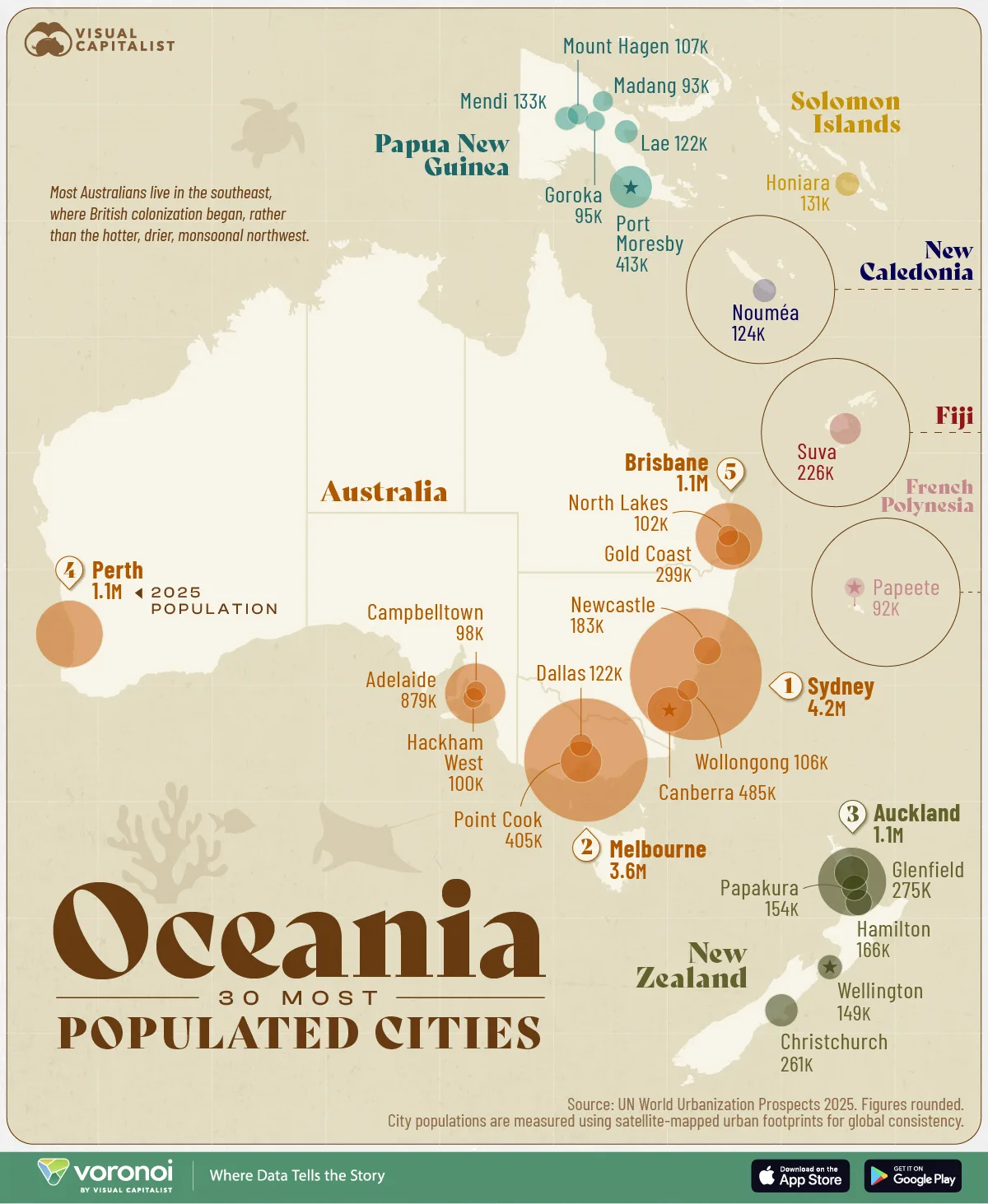 This infographic ranks Oceania’s 30 most populated cities in 2025 using data from the UN World Population Prospects 2025.