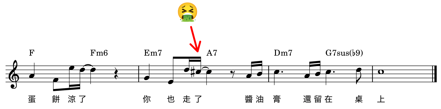 拜託各位作曲家,下次想要使用「六級屬七和弦配 ♯1 音級旋律」時,請三思而後行啊!畢竟你應該不希望有人在火鍋店聽到你的歌時,當場把沙茶醬噴出來吧。
