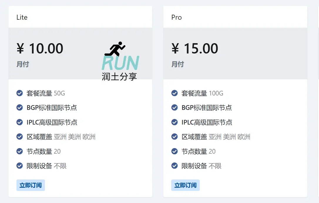 Lite:¥10/月,50G流量/月。