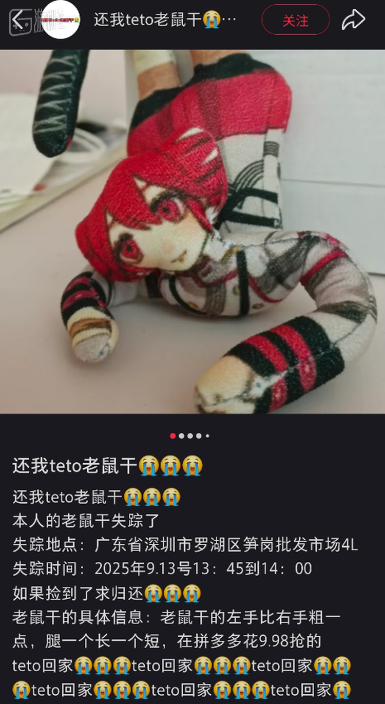 因而你会看到,尽管是很便宜的制品,一旦老鼠干丢失,还是有不少人在社交平台发布类似“孩子回家”的寻物启事。这种丢失后的失落,并不是轻易能用金钱去衡量的,原先那只陪伴了更长时间,承载了更多情感,新的老鼠干怎么也不如“失而复得”来得快乐,怎么也不能和原来的相提并论。
