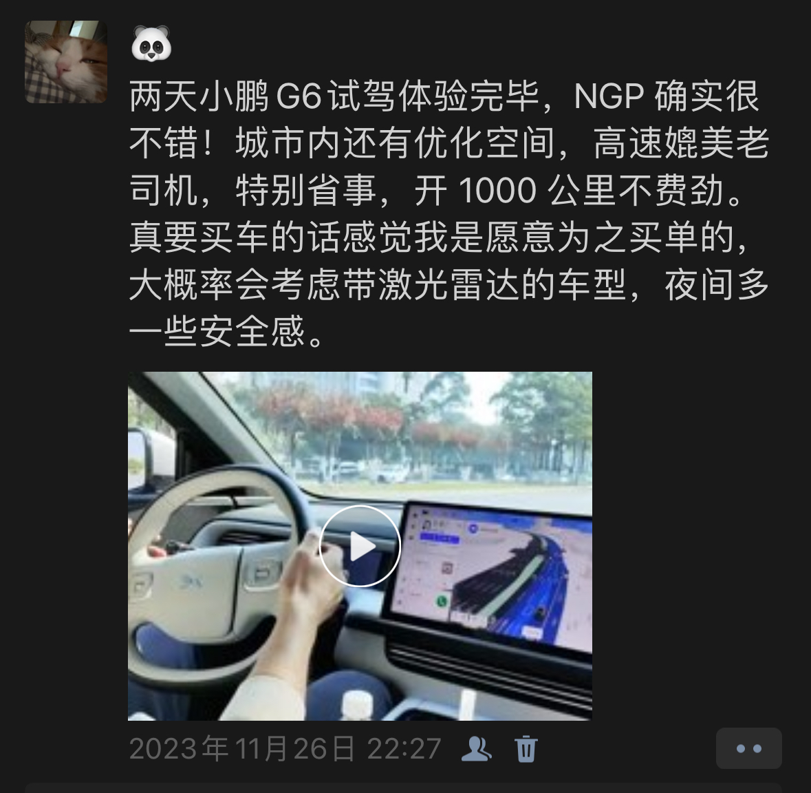 再后来,由于工作的关系,有机会借用公司的一辆小鹏 G6 开了大约八九百公里,G6 基本上代表当时最领先的新能源车智能化体验。过程中高强度地使用 XNGP 辅助驾驶,着实体会到了新技术对驾驶这件事的增益,激动得我回来后甚至发了条朋友圈盛赞 G6。不过最终我选择的车并不是 G6,这是后话。