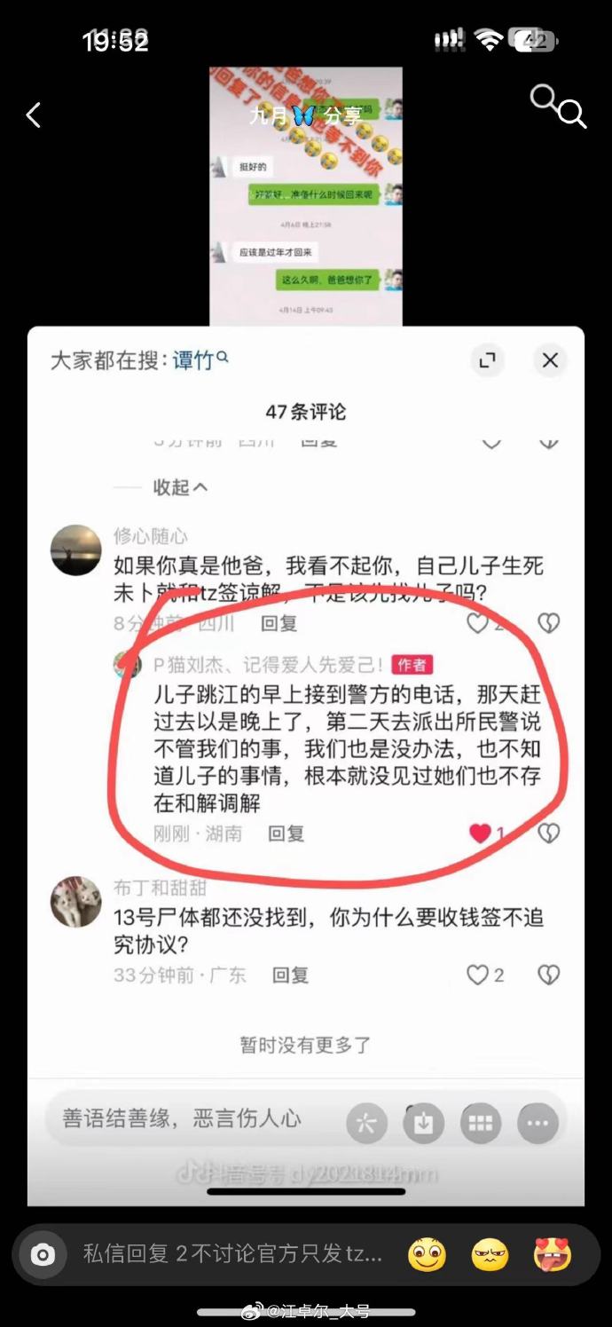 同一天早上,谭竹发布朋友圈声称:于是我也好想去冰冷的江水躺一躺啊……我心中无愧疚的是,不是为了钱接近你,也真心爱过你,我愧疚的是不爱你后却不真诚,和别人恋爱。你真的一个好好的男孩子啊,我对不起你,辜负了你的真心,你等等我好不好,算了你应该也不想见我,那你上天堂我下地狱12。