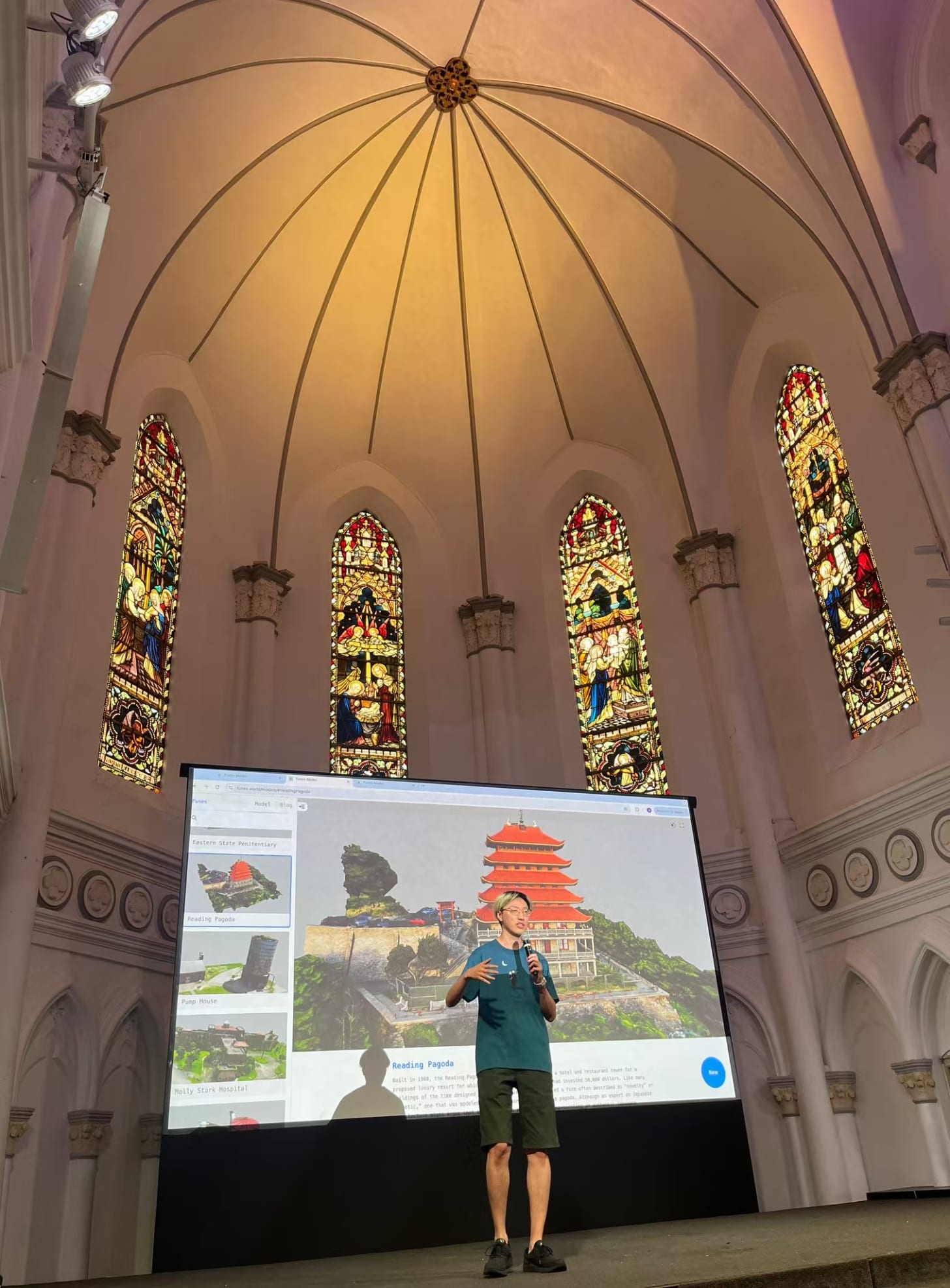 到了九月份后,因为活动比较多我就来了新加坡。实在是太热了,感觉自己在过一个永无止境的夏天。某个下午我正在给赞美礼堂(CHIJMES Hall)建模。因为 MegaETH 的活动在这,Shuyao 问我能不能在活动上展示一下 Funes,我说那就建模一下场地吧。刚弄好,当时还在 ABCDE 的 Siyuan 就给我发消息,说要不要来见一下他们的创始人杜均总。
