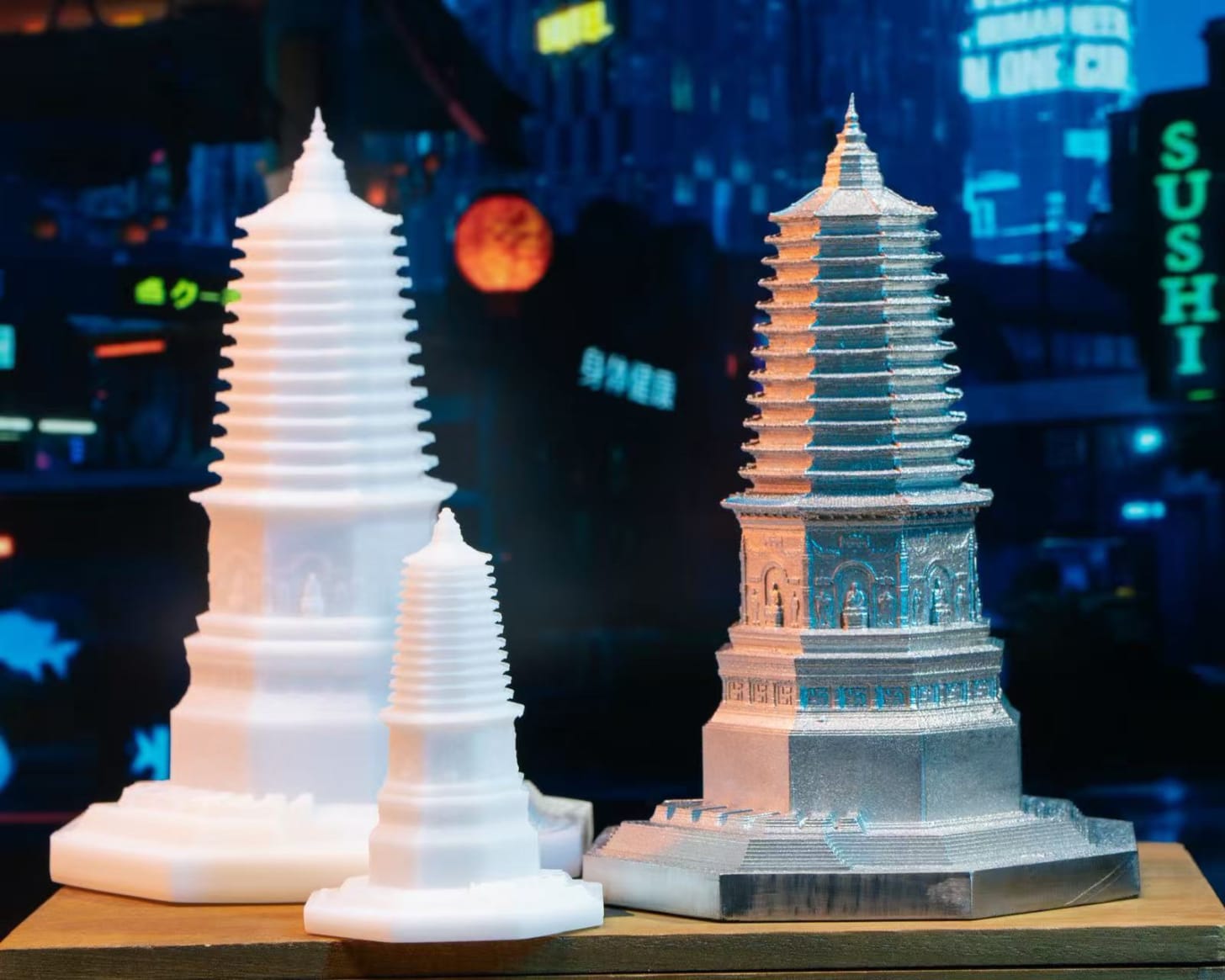 当时拿的是图里白色的这个大明塔,不过现在图里三个都已经送给朋友们了;左面两个是塑料 3D 打印,右边是不锈钢 3D 打印 + 抛光