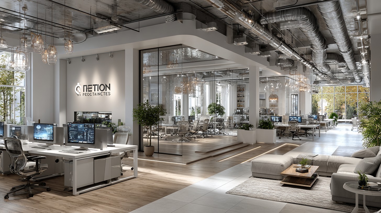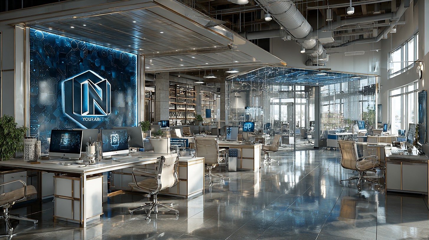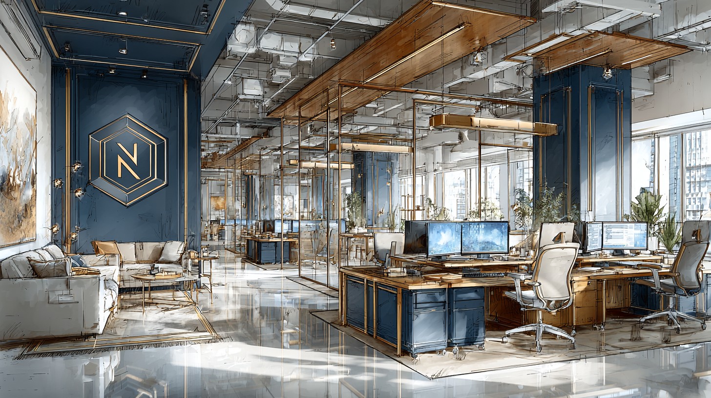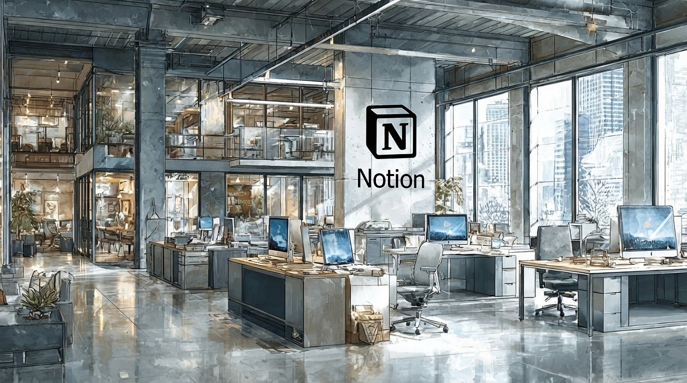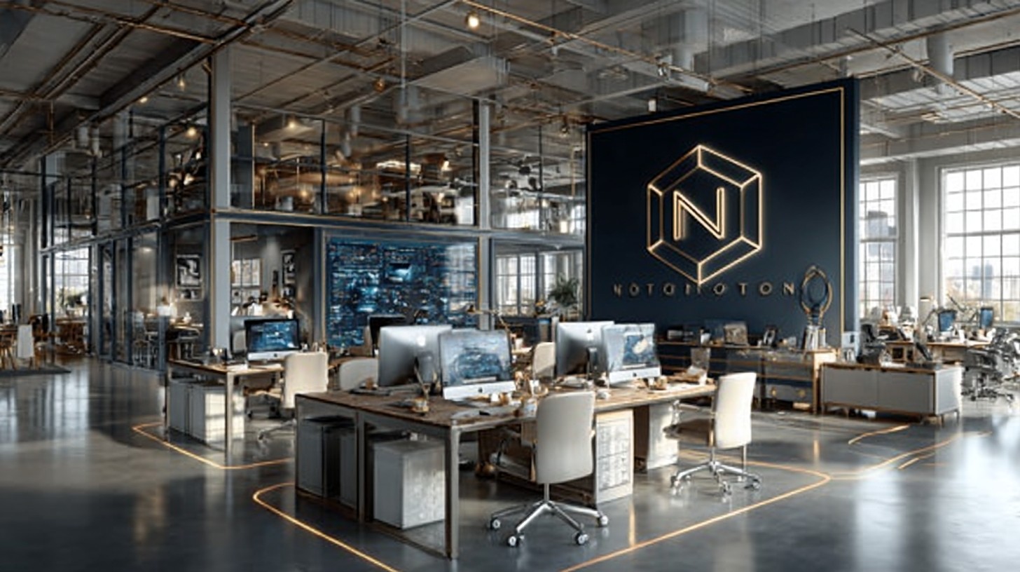 Prompt:high-contrast watercolor illustration, neon cyan rim light glowing edges, deep navy blue background, cinematic dramatic composition, sharp subject isolation with clean separation, minimal color palette of ink-deep navy, vibrant neon cyan, subtle gold metallic accents, glossy reflective surfaces on white and light gray modern office furniture, San Francisco Bay Area winter internet company office interior, predominantly white and light gray color scheme furniture and home-like decor, simple clean black line accents, minimalist Notion-style aesthetic, large Notion logo (bold black serif N inside geometric cube outline) prominently hanging on the wall, extremely legible negative space designed for text overlay, sleek modern desks with monitors, ergonomic chairs in pale tones, subtle gold highlights on metal frames, soft diffused winter daylight mixed with neon cyan rim lighting, ultra-detailed watercolor brush strokes, high contrast, –ar 16:9 –raw –s 250 –v 7.0 –p lh4so59