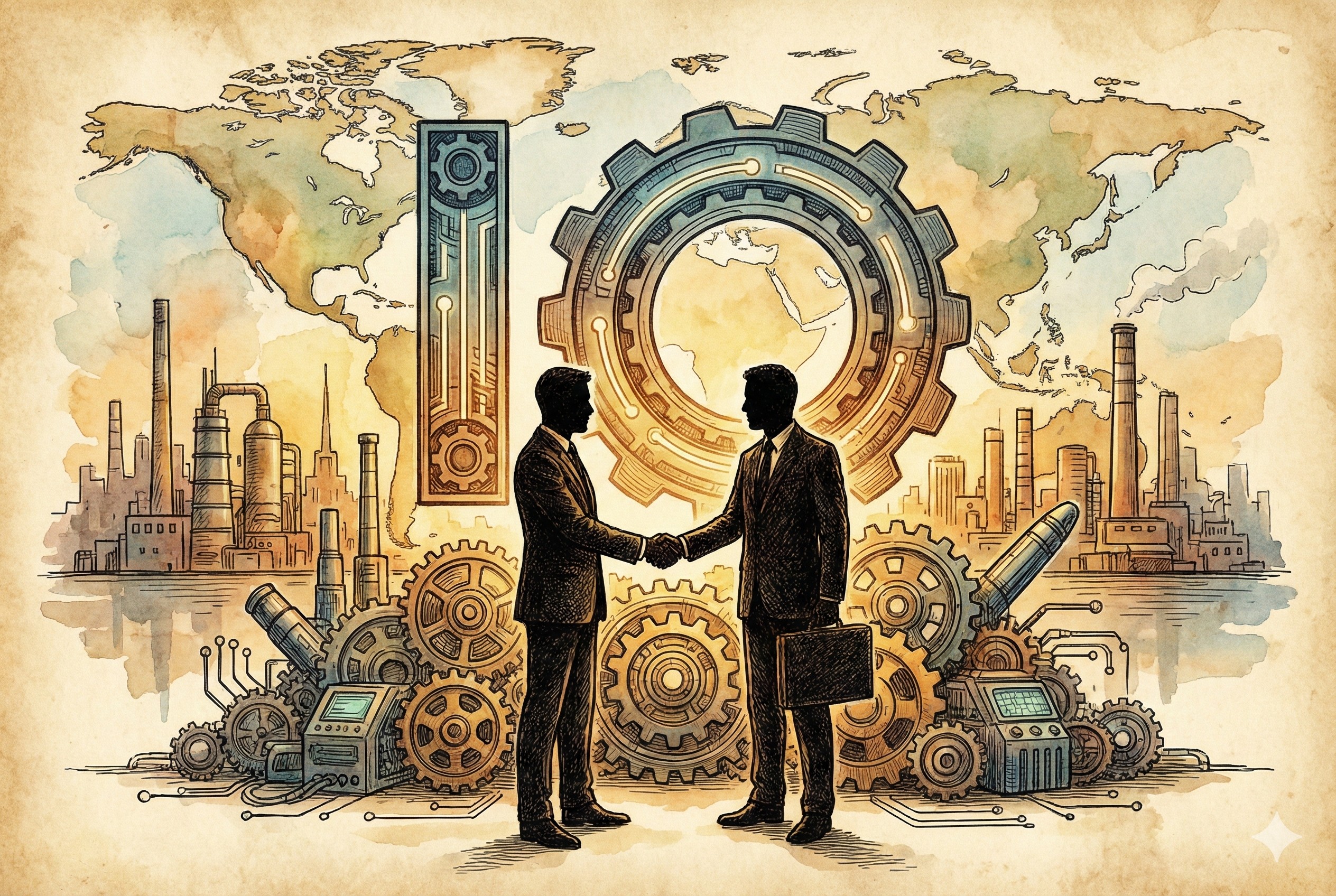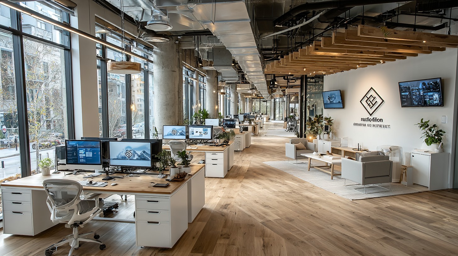 Prompt:watercolor painting in high-contrast style, luxurious high-rise AI company office in Singapore’s Marina Bay with open workstations and glass-walled meeting rooms staggered throughout, floor-to-ceiling windows revealing the Strait of Malacca at sunset with a massive container ship sailing through, glossy reflections on glass and polished surfaces, sharp subject separation, extremely legible negative space for text overlay, neon cyan rimlight, deep navy background, minimal palette of ink blue neon cyan and gold accents, subtle warm sunset gradients,cinematic composition, ultra-detailed –ar 16:9 –stylize 750 –v 7.0 –p lh4so59
