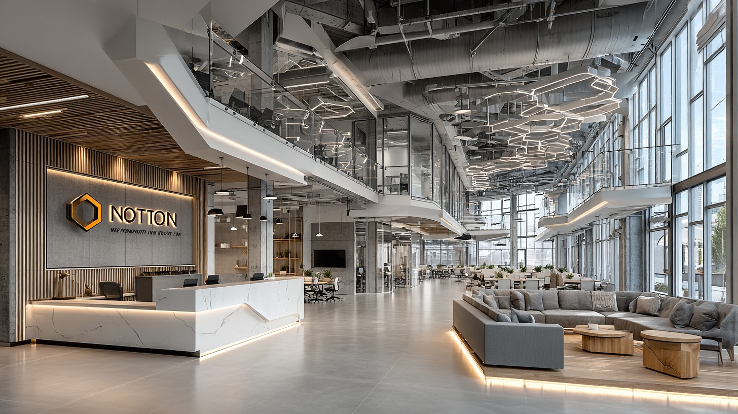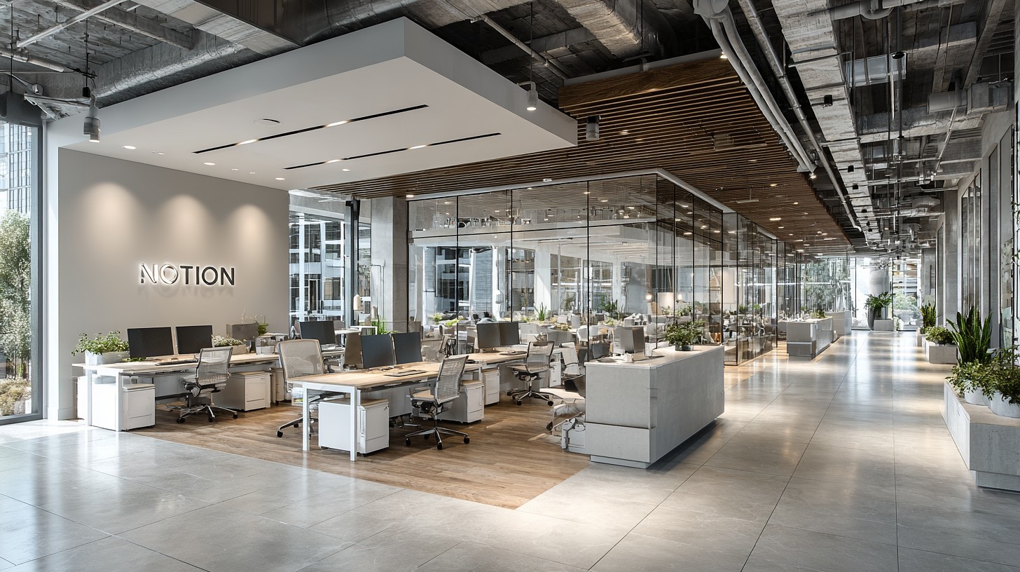Prompt:minimalist tech office interior in San Francisco Bay Area during winter, clean white and light gray color scheme with simple black linear accents, Notion-inspired aesthetic, large wall featuring the Notion company logo, modern ergonomic furniture, open workspace with natural daylight filtering through large windows, soft overcast winter light, cool neutral tones, wide-angle view from entrance, ultra-detailed, sharp focus –ar 16:9 –raw –s 250 –v 7.0 –p lh4so59