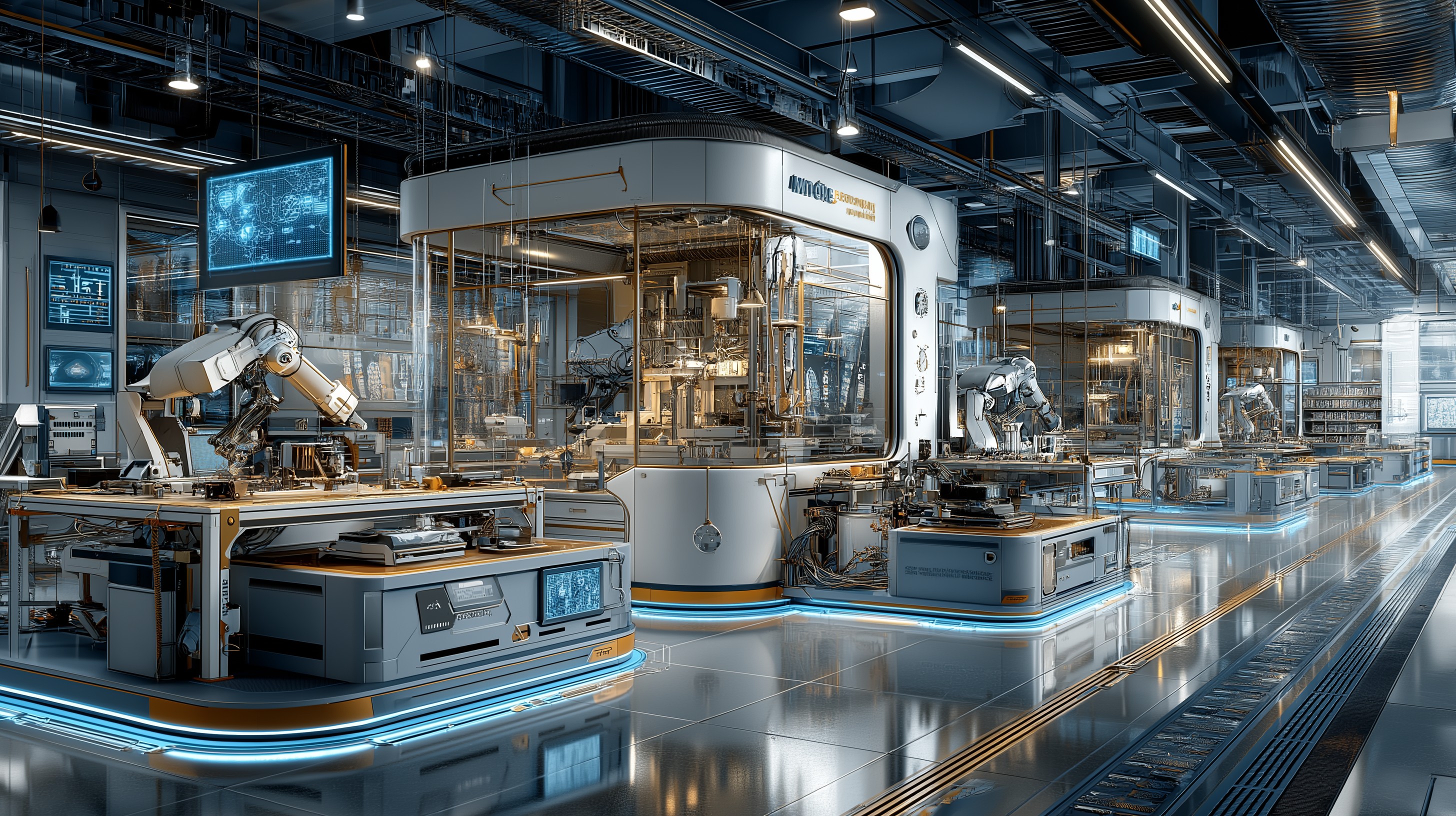 Prompt: high-contrast watercolor illustration, futuristic iPhone assembly line in a sleek high-tech factory interior with pristine white as dominant decor tone, streamlined conveyor belts featuring precise robotic arms at each station meticulously assembling components, neon cyan rim lighting, deep navy blue background, sharp subject separation, glossy reflections on metallic surfaces and glass panels, minimal palette dominated by ink blue neon cyan and subtle gold accents, cinematic composition, expansive legible negative space for text overlay, intricate ink washes, ultra detailed, clean minimalist industrial design –ar 16:9 –raw –s 250 –v 7.0 –p lh4so59