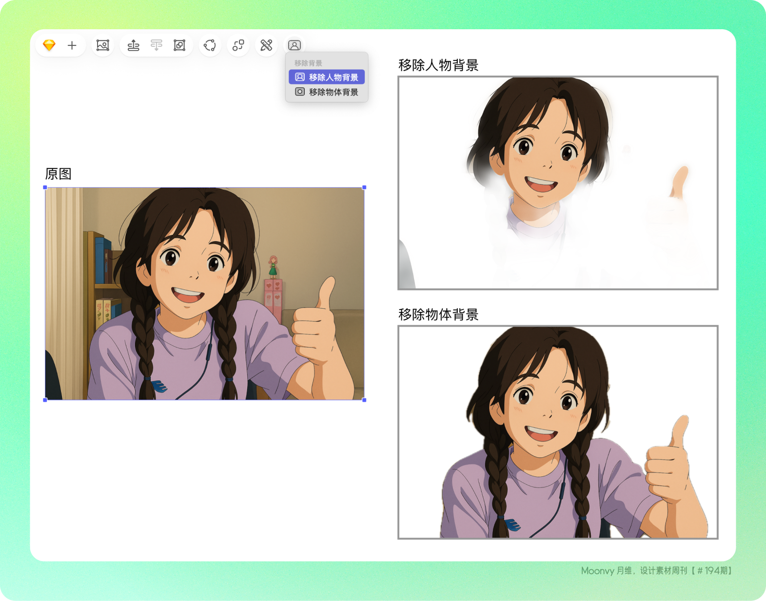 Sketch 最新上线了“一键背景移除”功能,基于 Apple 的 Vision API,所有处理都在本地完成。抠图更快、更安全,提供了两个选项「移除人物背景」和「移除物体背景」,简单试用了一下,如果抠图效果不好,可以两个模式都试试看,优点就是免费不限量
