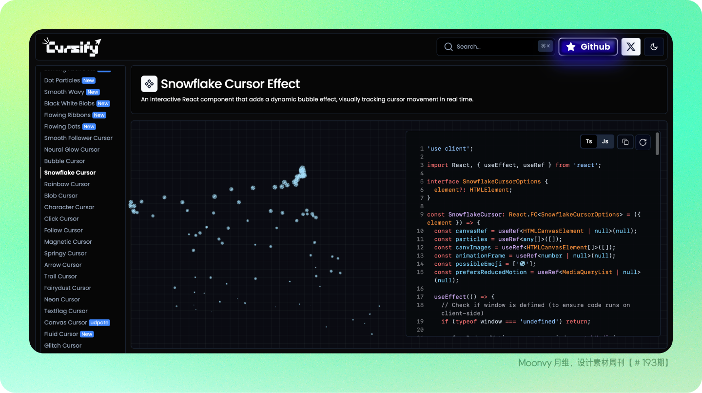 适合冬季节日场景的鼠标特效,雪花会在光标移动时动态生成并跟随轨迹,带来轻松又灵动的交互体验