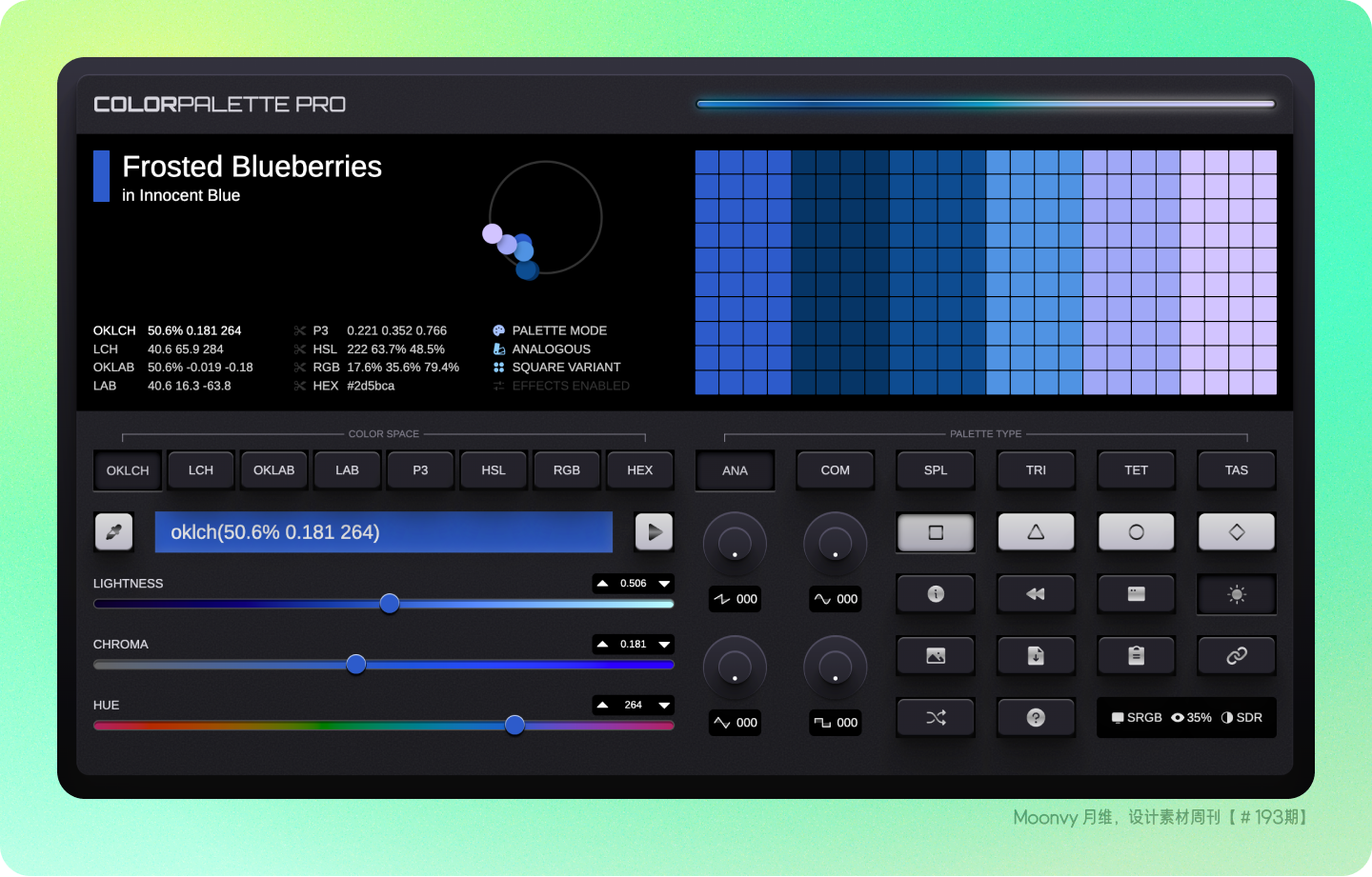 一个拟物风设计的在线配色工具,支持丰富的颜色格式,可根据任意颜色自动生成配色方案