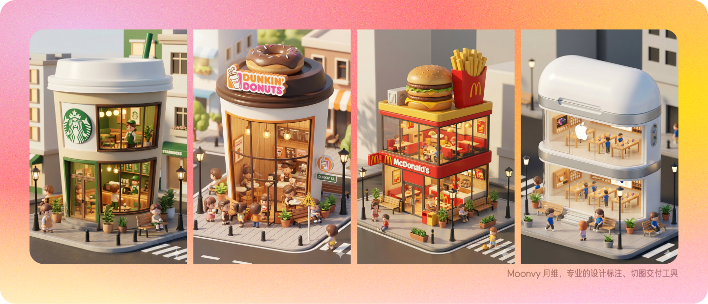 来源,宝玉@dotey 3D chibi-style miniature concept store of {Brand Name}, creatively designed with an exterior inspired by the brand's most iconic product or packaging (such as a giant {brand's core product, e.g., chicken bucket/hamburger/donut/roast duck}). The store features two floors with large glass windows clearly showcasing the cozy and finely decorated interior: {brand's primary color}-themed decor, warm lighting, and busy staff dressed in outfits matching the brand. Adorable tiny figures stroll or sit along the street, surrounded by benches, street lamps, and potted plants, creating a charming urban scene. Rendered in a miniature cityscape style using Cinema 4D, with a blind-box toy aesthetic, rich in details and realism, and bathed in soft lighting that evokes a relaxing afternoon atmosphere. --ar 2:3