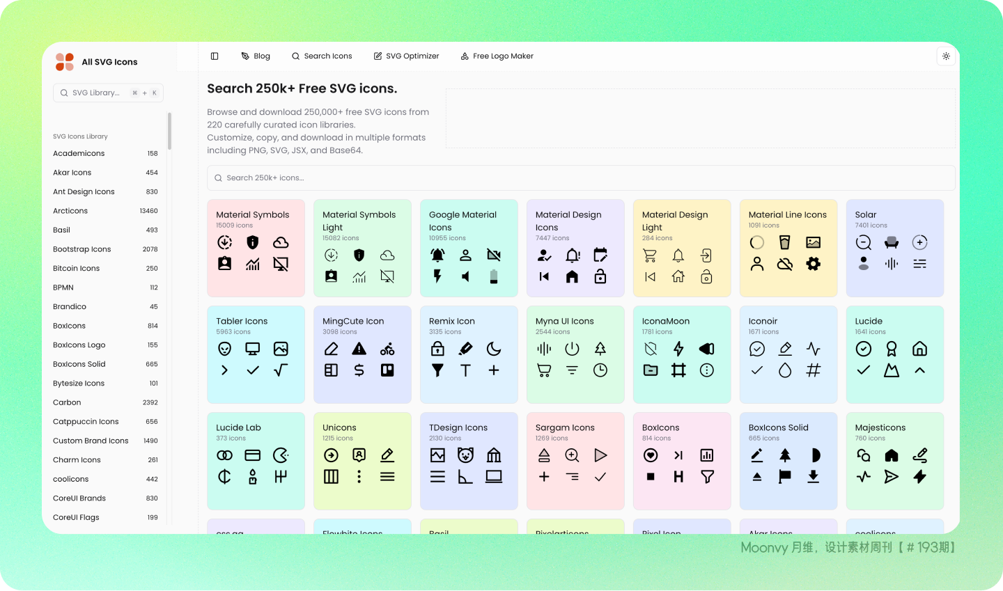 来自 220 个精心挑选的图标库的超过 25 万个免费 SVG 图标。 支持多种格式下载,包括 PNG、SVG、JSX 和 Base64
