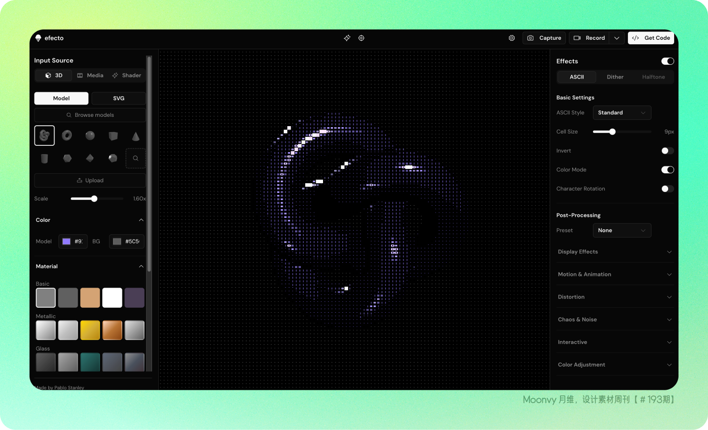 使用 Efecto,你可以为图像、视频或 3D 模型实时叠加多种艺术效果,包括 ASCII、抖动、半色调等独特风格。并提供互动控制,调整颜色、背景、旋转与缩放