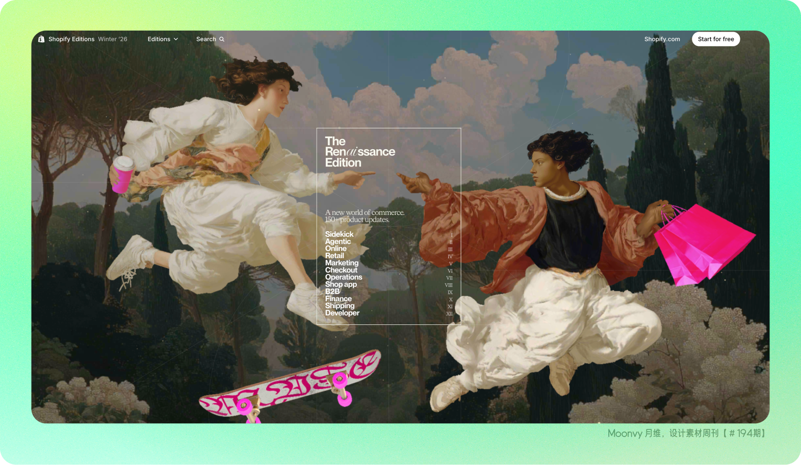 Shopify 每次有重大更新时,都会做一个超级夸张的介绍网站。整站的每个 Section 都用了 Three.js 和 WebGL2 来做渲染,而且每个部分都有自己独立的彩蛋(Easter Egg)。