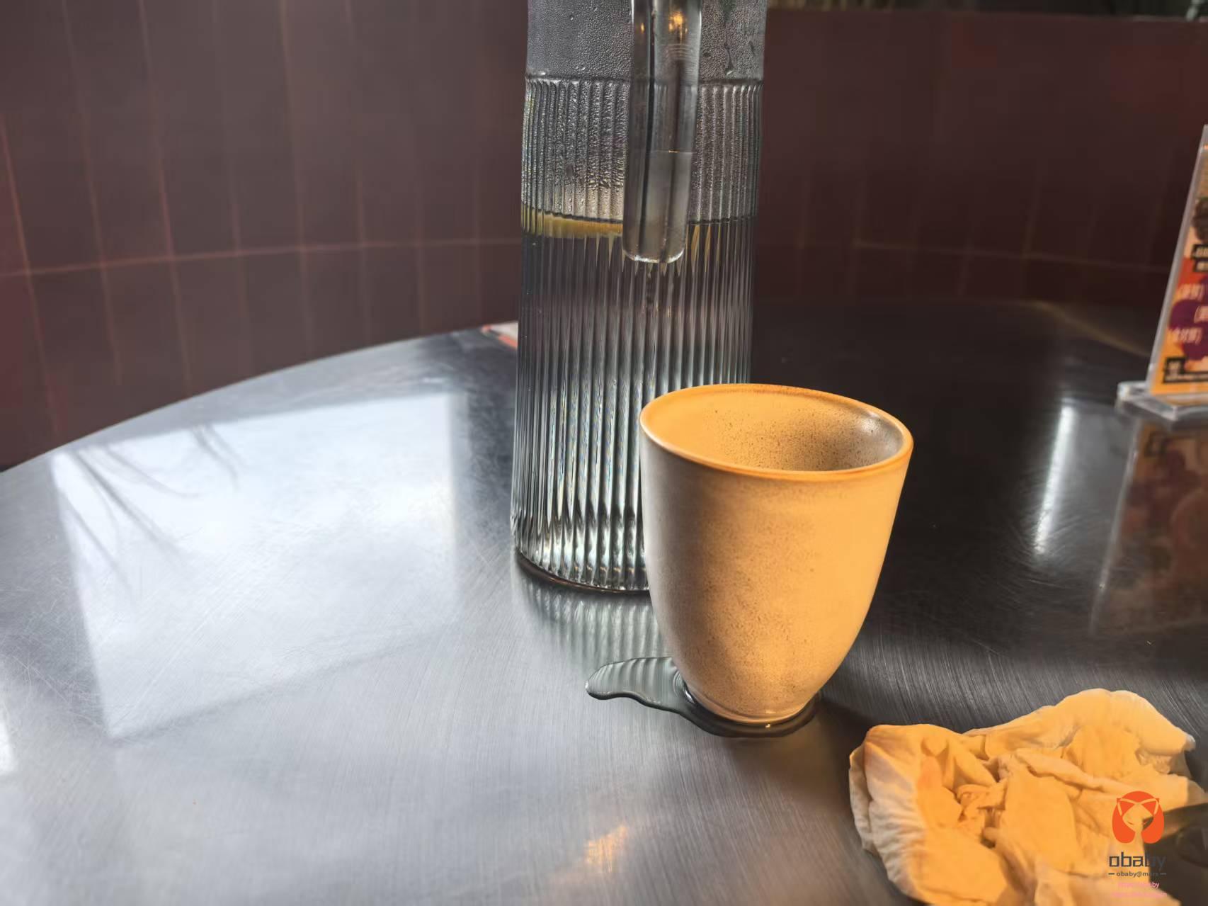 点菜之后,等了会儿服务员给送来了一大瓶水,还有两个杯子。不过在倒完水之后,过了段时间,看桌子上一滩水,当时就有点懵。结果仔细一看,那个水杯在漏水。
