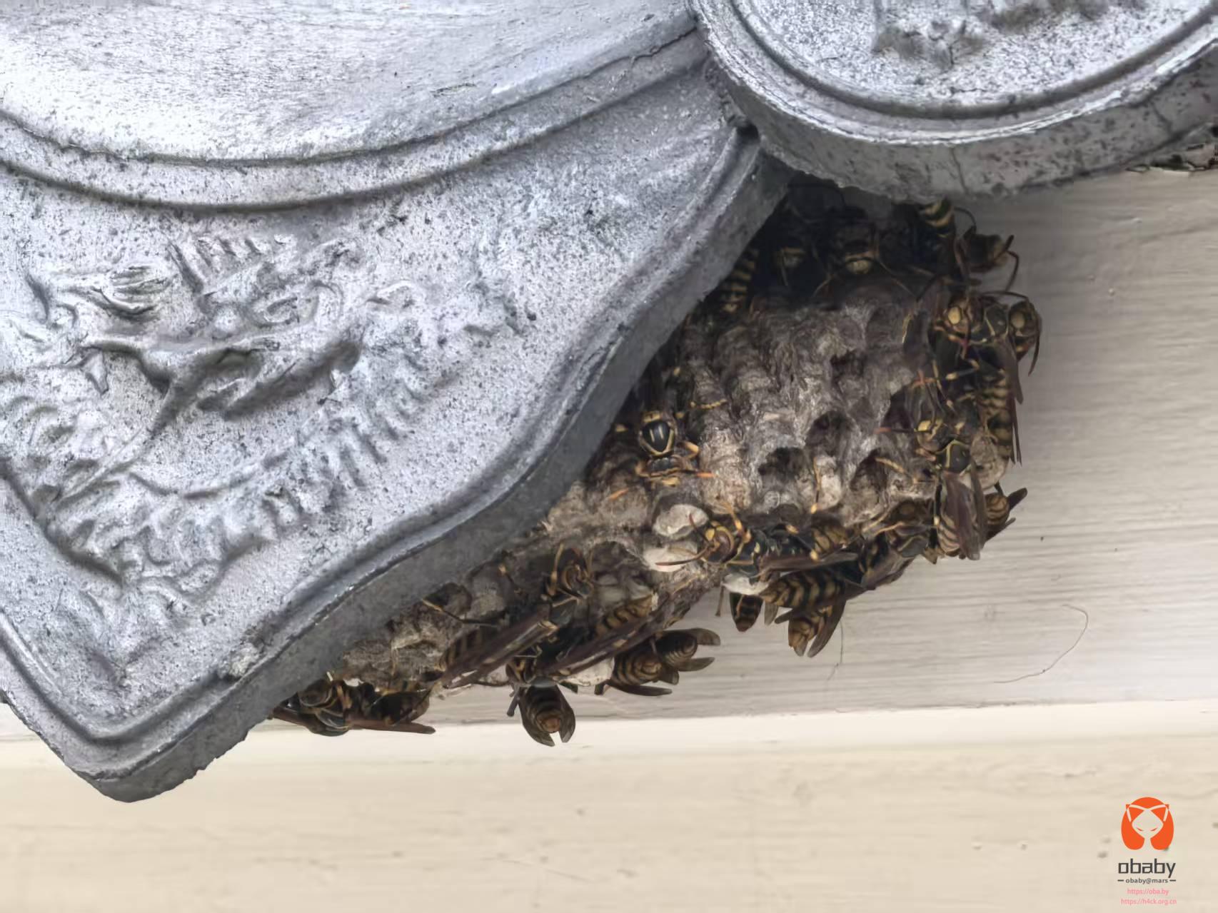 围墙屋檐下,挂着一个硕大的马蜂窝,上面的马蜂已经归巢,密密麻麻的一层。