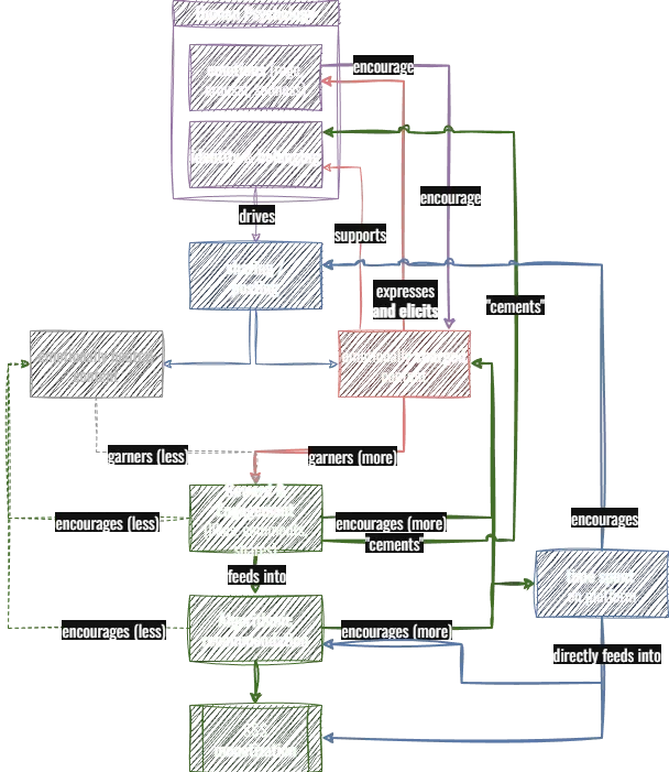 A flowchart visualizing the relationships between human psychology, content sharing, engagement, rewards, and monetization. (Which, in case you can't tell, is not AI generated. Created by hand using draw.io, for better or worse.) I have done my best to provide a detailed verbal description of the flow below.