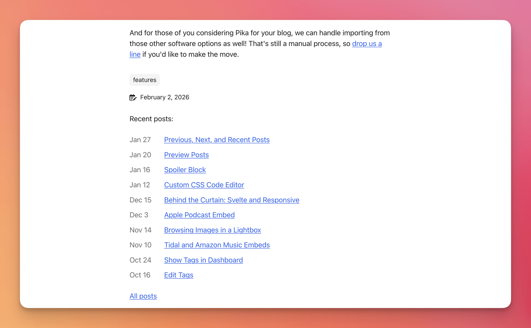 And for those of you considering Pika for your blog, we can handle importing from those other software options as well! That’s still a manual process, so drop us a line if you’d like to make the move.