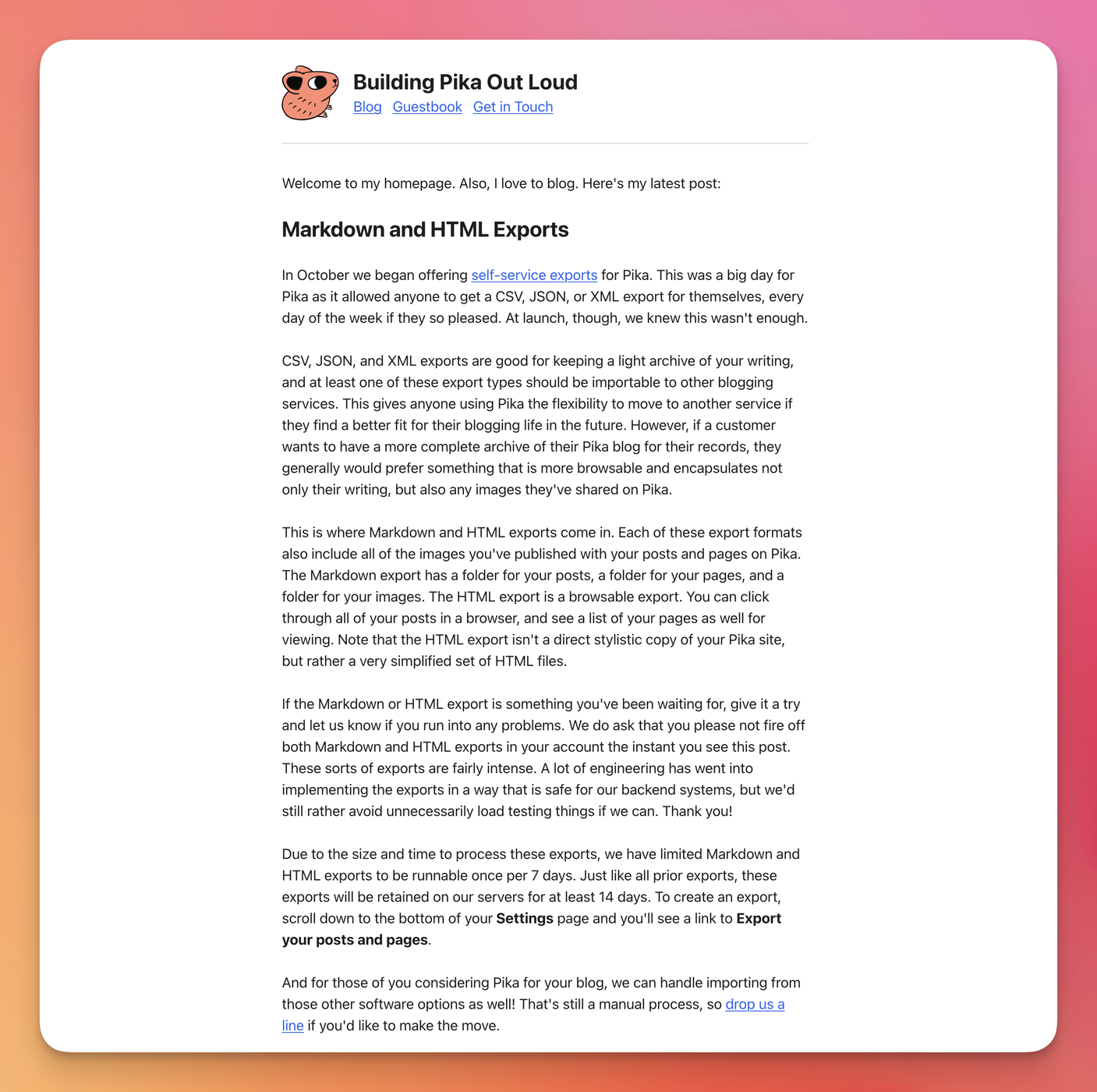 CSV, JSON, and XML exports are good for keeping a light archive of your writing, and at least one of these export types should be importable to other blogging services. This gives anyone using Pika the flexibility to move to another service if they find a better fit for their blogging life in the future. However, if a customer wants to have a more complete archive of their Pika blog for their records, they generally would prefer something that is more browsable and encapsulates not only their writing, but also any images they’ve shared on Pika.