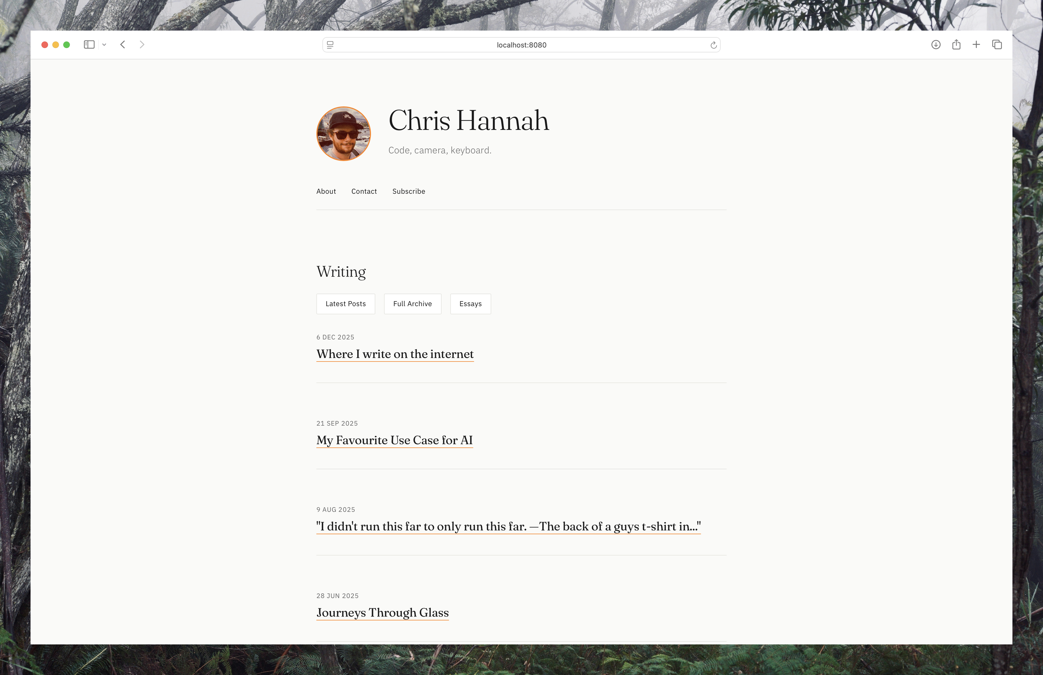 Once the site was built, it was quite easy to make small additions such as dark mode, better fonts, etc. The understanding of the code and context around what the site is still impresses me. The fact that I can say "change the nav bar on the home page to X", and it can work out what file and bit of code to change is pretty cool.