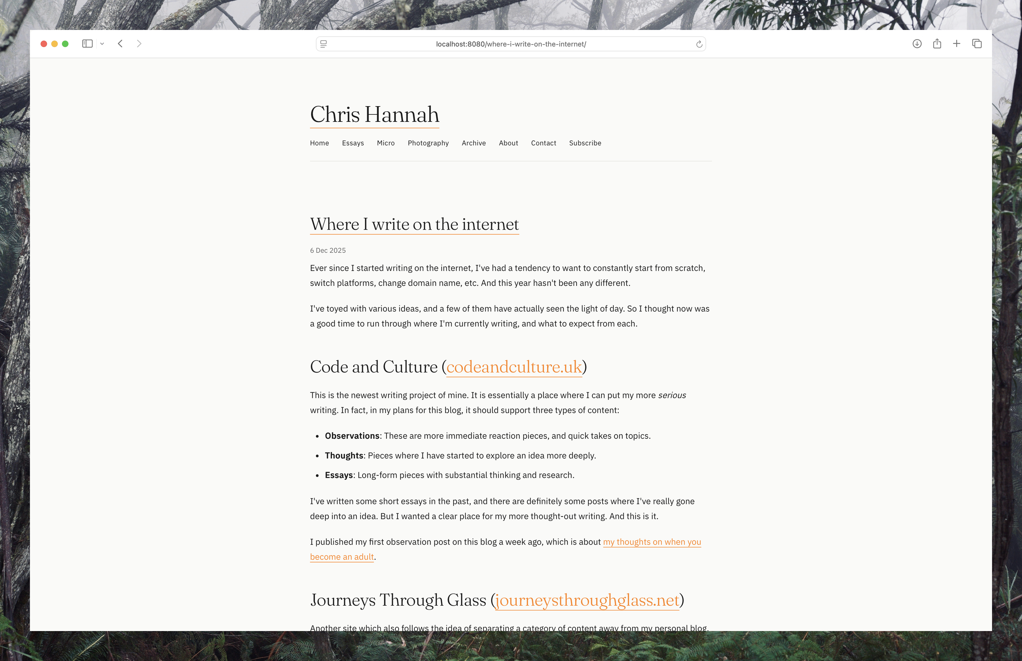 But another reason why I wanted to separate some writing onto other sites, is that this is my personal blog. So it's going to be messy sometimes. It's going to be a place where I share photos, links to videos, really quick thoughts, and opinions that probably won't hold up for very long.