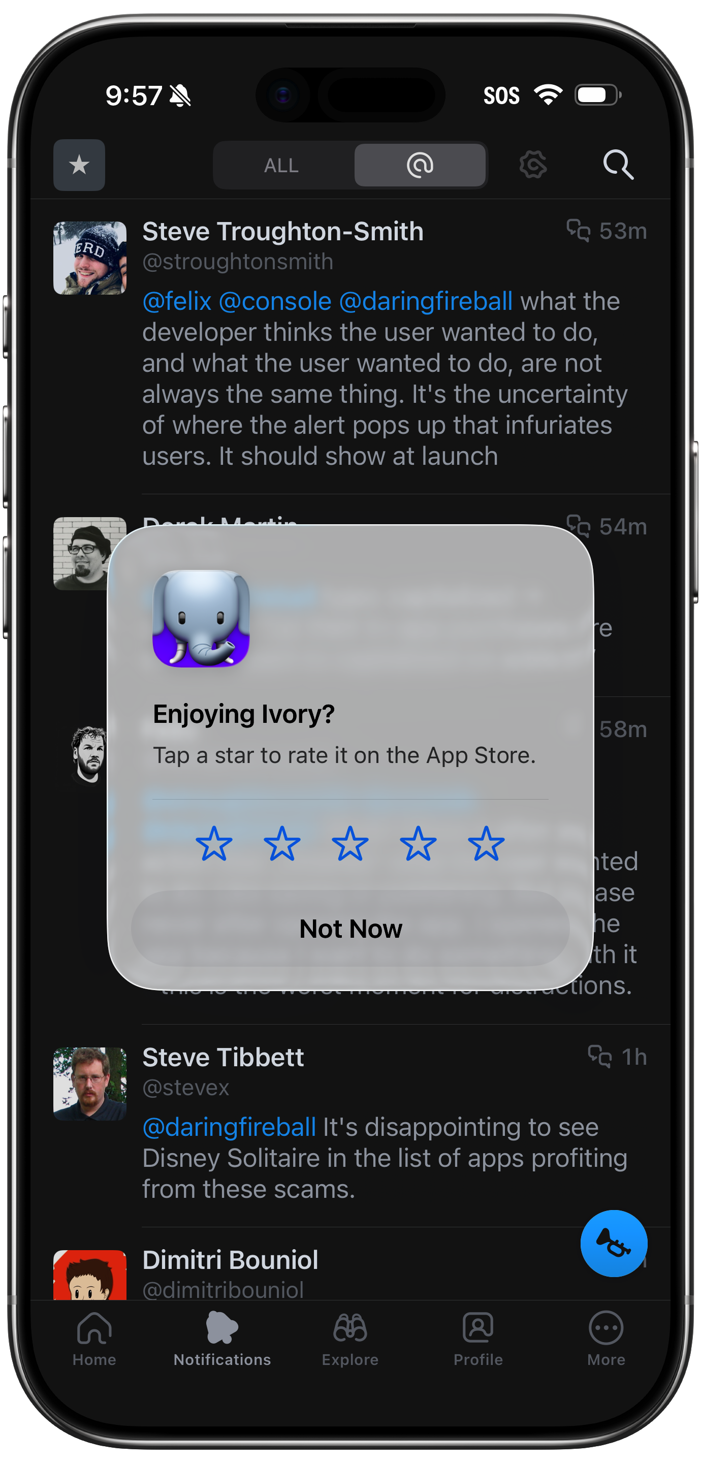 The funny thing is, this morning while I was reading the Mastodon thread with Troughton-Smith’s post, Ivory prompted me for a rating. Which I dutifully submitted. 5 stars, of course. Which brings me to another follow-up point. A few readers have emailed to object to the argument that it hurts developers to give apps anything short of a 5-star rating. (A few of these readers are from Germany, no surprise.) It’s logical, I agree, that a 4-star rating ought to be considered fair and just for a good app with obvious room for improvement. But anything short of 5 stars pulls down any good app’s average, because the overwhelming majority of users who rate apps only ever assign 5 stars for apps they like, or 1 star for apps they’re angry about. In a system where the overwhelming majority of users only ever assigns 1 or 5 stars, assigning 4 stars is effectively a mildly negative review. That sucks. Apple should fix it. But until they do (which, let’s face it, they probably won’t), obstinately ignoring that this is how App Store ratings work does not help good apps get the attention you think you’re helping them get with a 4-star rating.