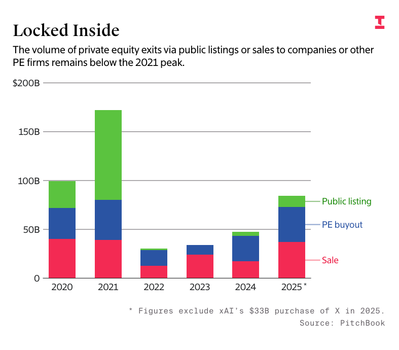 Per PitchBook, since 2022, 70% of VC-backed exits were valued at less than the capital put in, with more than a third of them being startups buying other startups in 2024. Private equity firms are now holding assets for an average of 7 years,