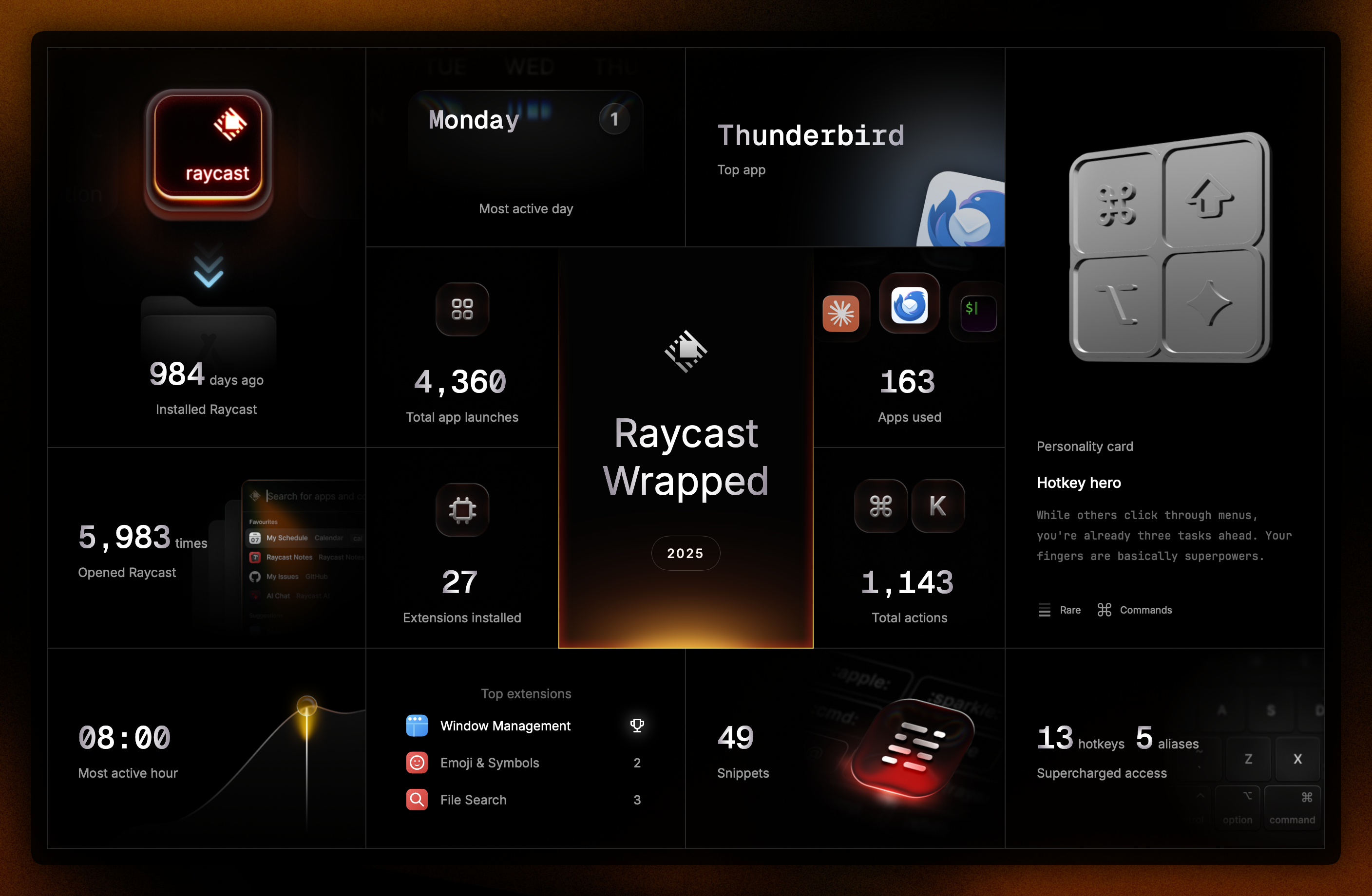 Ik weet niet hoe het met jullie zit, maar we worden overstelpt met de Wrapped tours deze dagen. Het begon natuurlijk bij Spotify maar inmiddels hebben LinkedIn, Apple, Reddit, Discord en anderen ook deze eindejaars-truc gevonden voor een glimlach over de hoeveelheid data die ze verzamelen… Ik kreeg net de Raycast Wrapped. Hoevaak open ik deze applicatie-snelstarter, welke apps open ik er mee, welke scripts en op welk moment van de dag. Schijnbaar is deze Hotkey Hero op maandag om 8:00 het meest actief… Wat ze zelf er over zeggen: Disclaimer: Most of the data displayed is stored locally, and Raycast does not have access to it. If you moved between machines during the year, some of the data might have been lost.