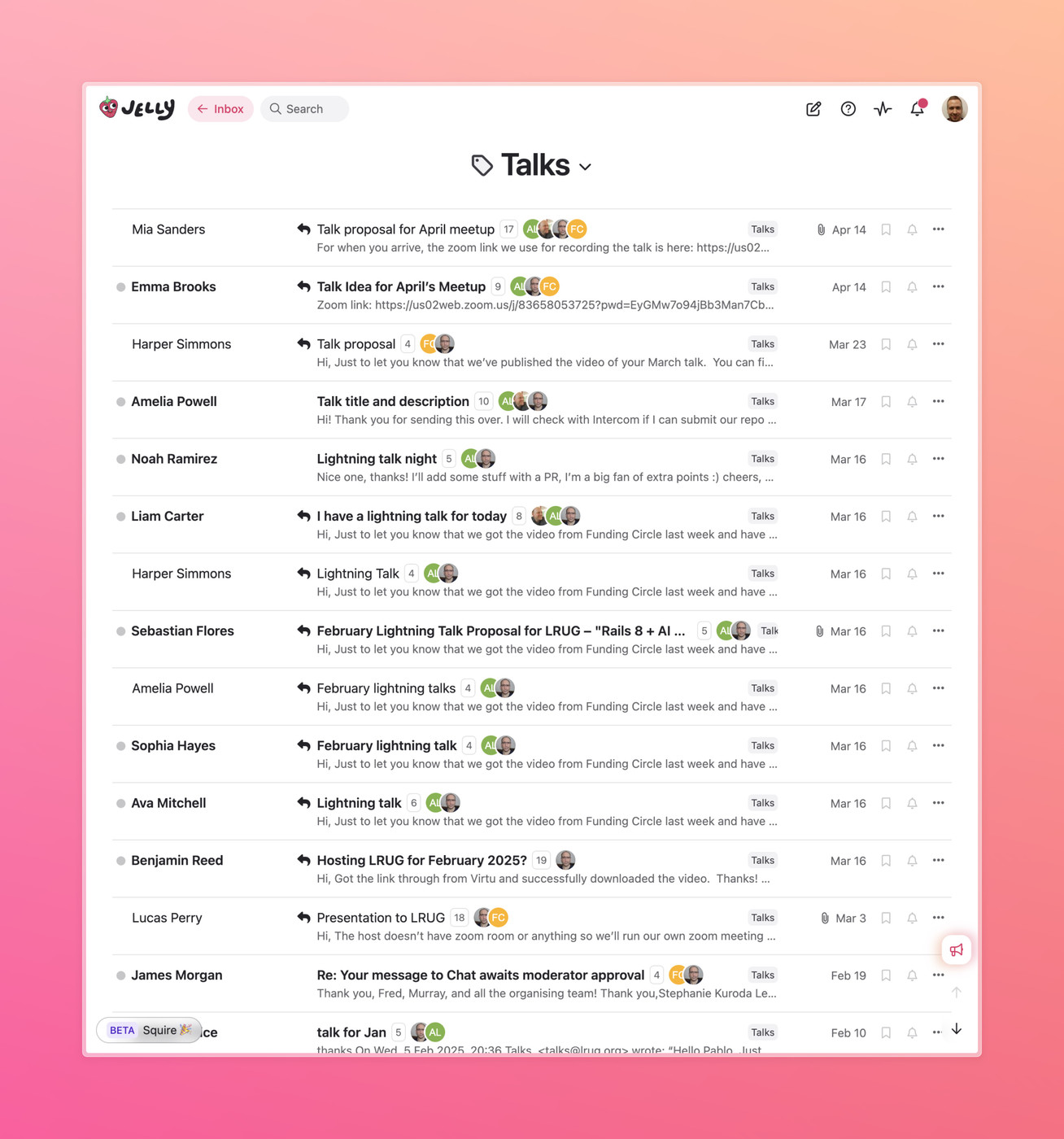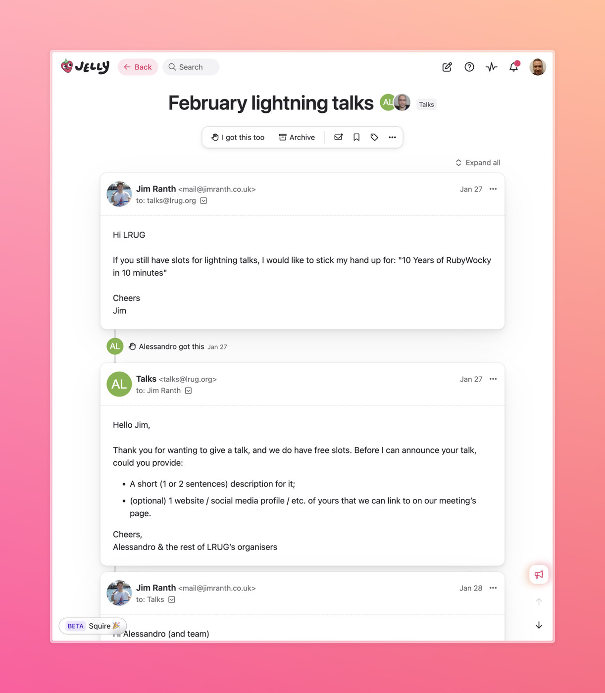 As well as talk proposals, LRUG uses Jelly to coordinate with venues, to field questions from community members and attendees, and to coordinate with other user groups. Jelly acts as a shared inbox for all of LRUG’s communication, with specific email addresses for sponsors, job posting to the mailing list, and general organisational matters. Jelly handles everything.
