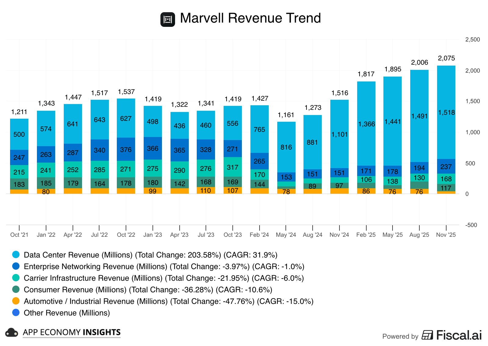 You might notice a massive $1.9 billion windfall in “other income” in the top right. This is a one-time gain from the sale of Marvell’s Automotive Ethernet business to Infineon during the quarter. While it boosted the bottom line significantly, it is a non-recurring event, which also explains why the Automotive/Industrial revenue segment dropped sharply year-over-year.