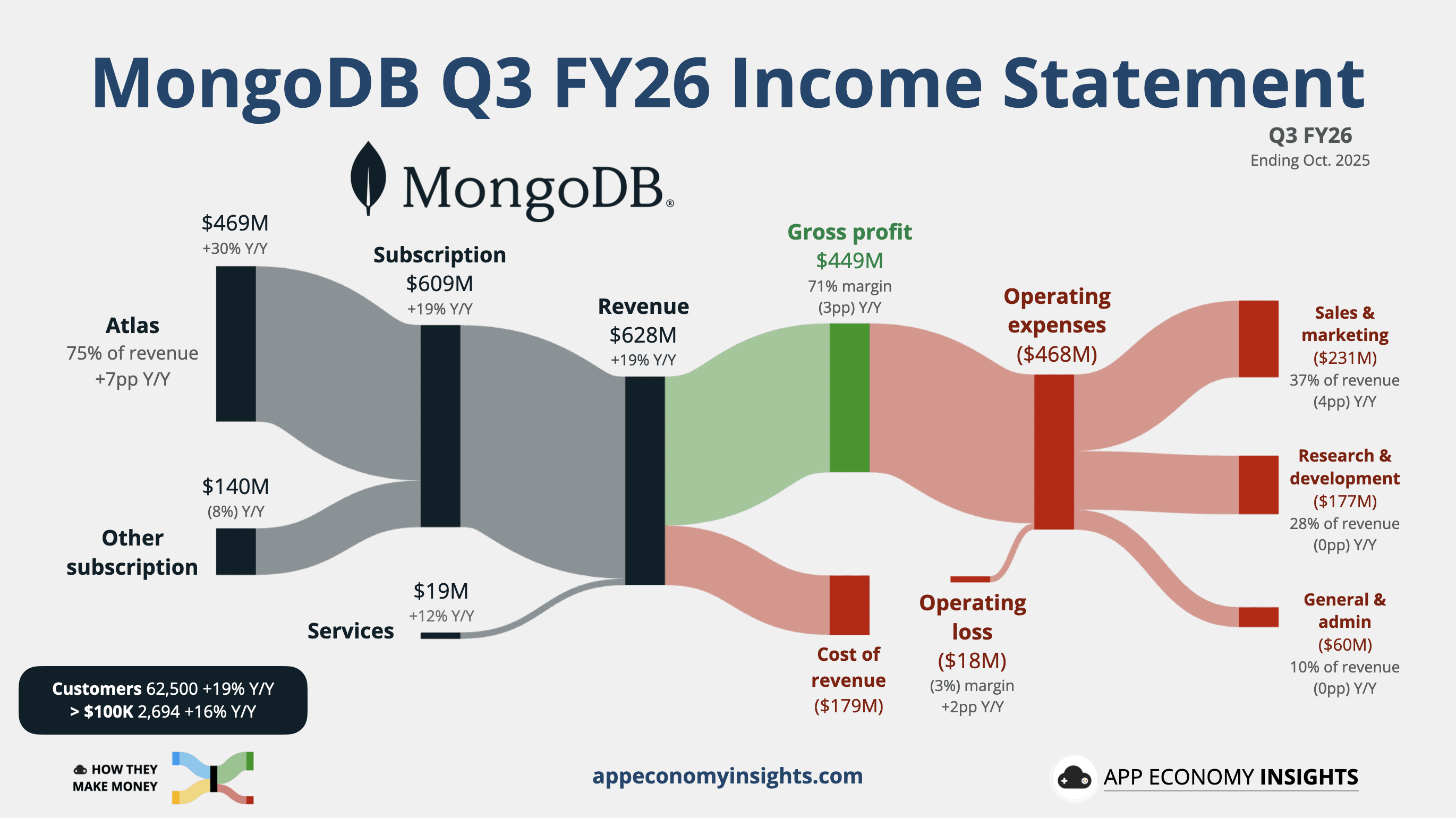 The highlight: Developer data platform Atlas accelerated to 30% Y/Y, its fastest pace in six quarters (up from 29% Y/Y in Q2). Atlas now represents 75% of revenue, up from 68% a year ago, driven by strong enterprise demand, healthy developer adoption, and broad-based strength across geographies.