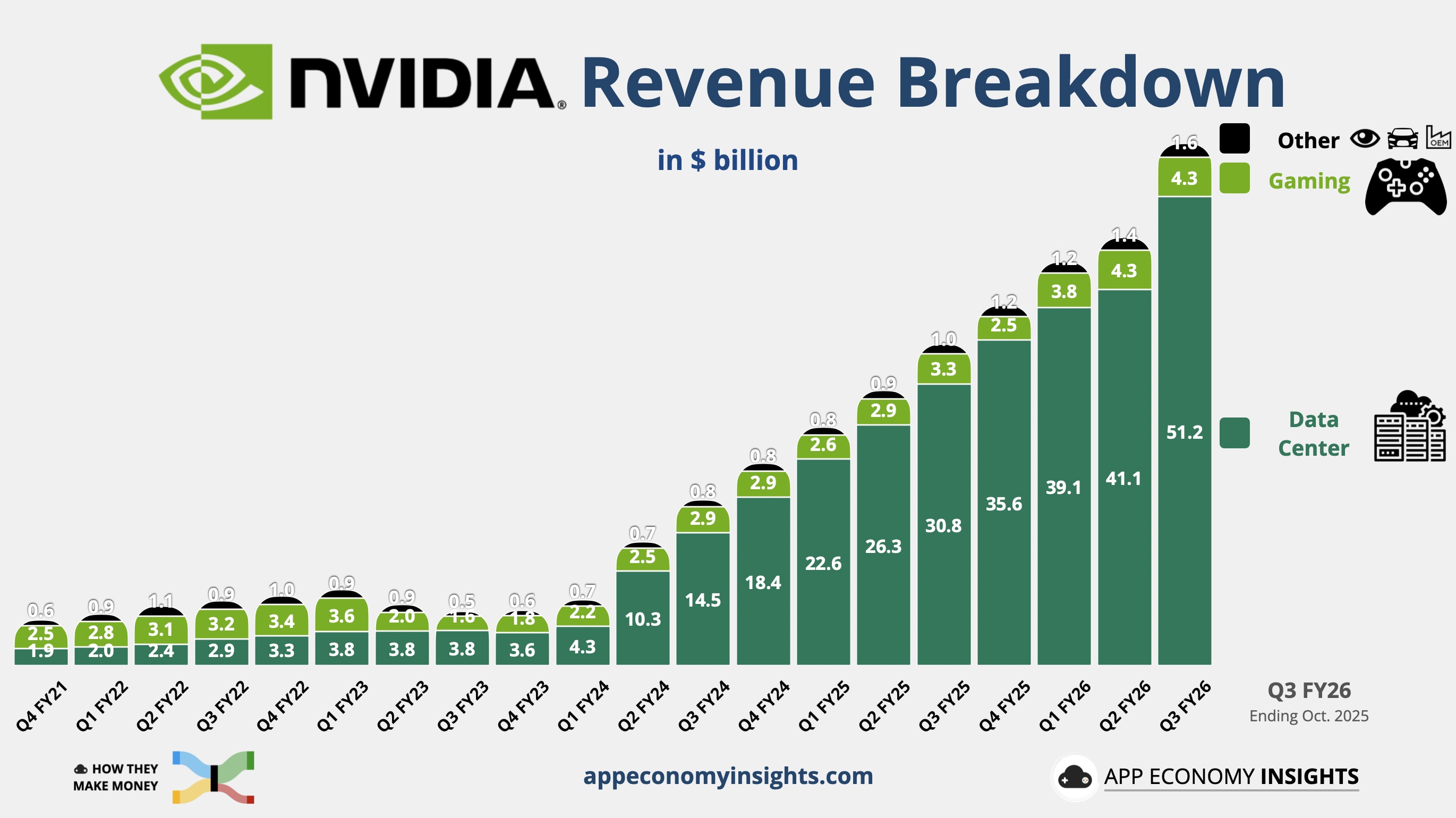 🎮 Gaming was mostly flat Q/Q at $4.3 billion, lapping the Blackwell-powered GPU launch last quarter but still up 30% Y/Y. GeForce maintains strong demand, even as the company reallocates more supply toward Data Center.