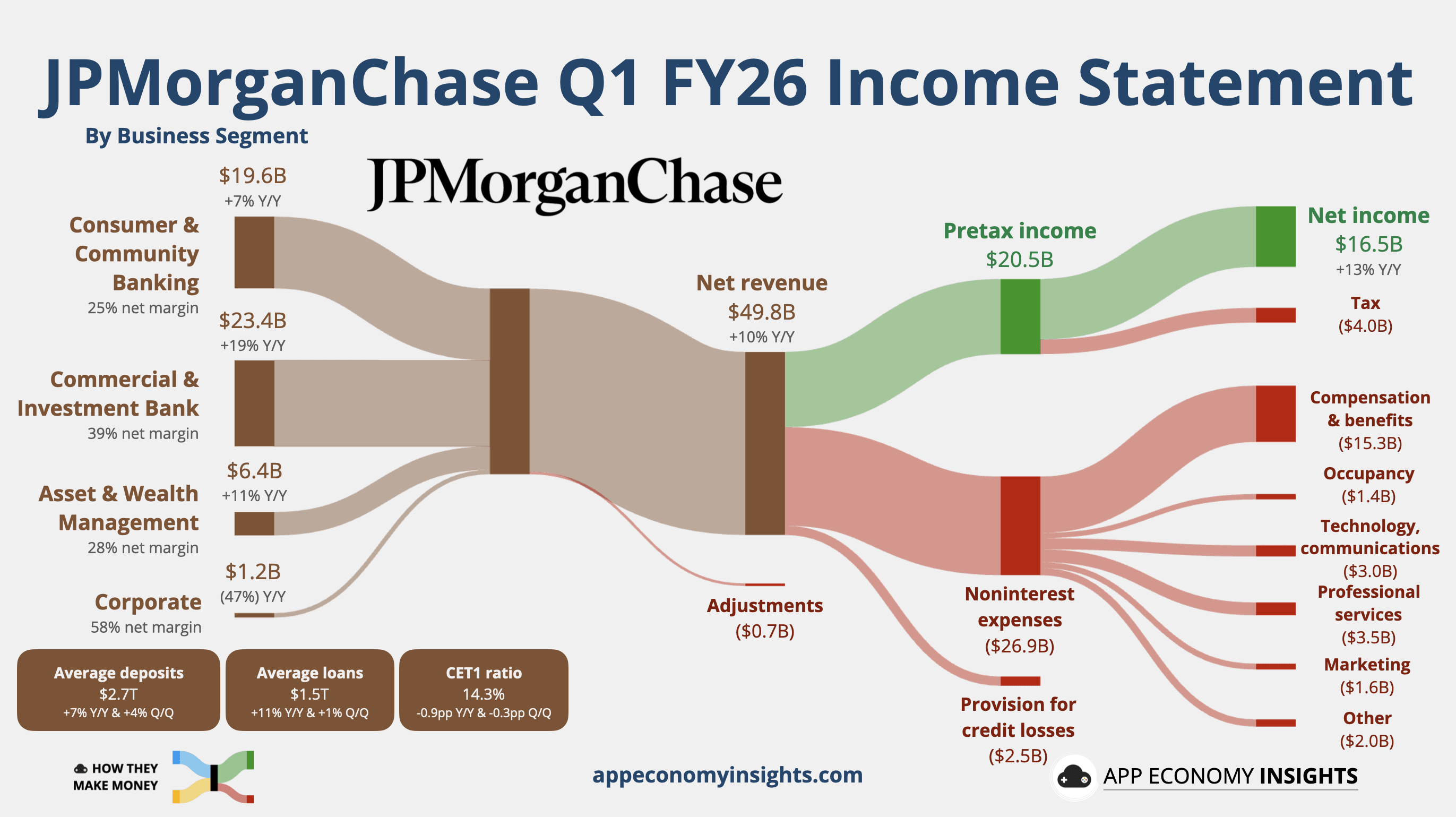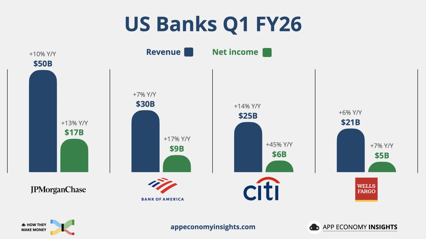 📈 Trading breaks records: JPMorgan’s traders delivered their highest-ever quarterly revenue, pulling in $11.6 billion (+20% Y/Y). The performance was fueled by record-breaking results in equities and a 21% surge in Fixed Income. Volatility from the Middle East conflict and AI-driven tech swings created a perfect environment for the trading desks to capture volume.