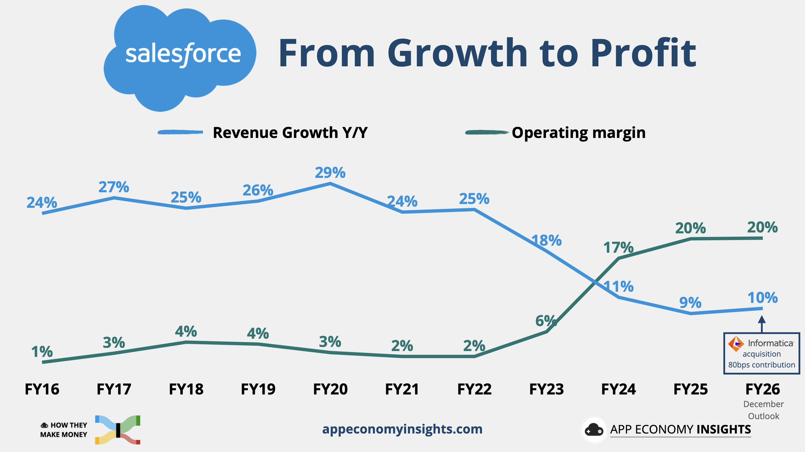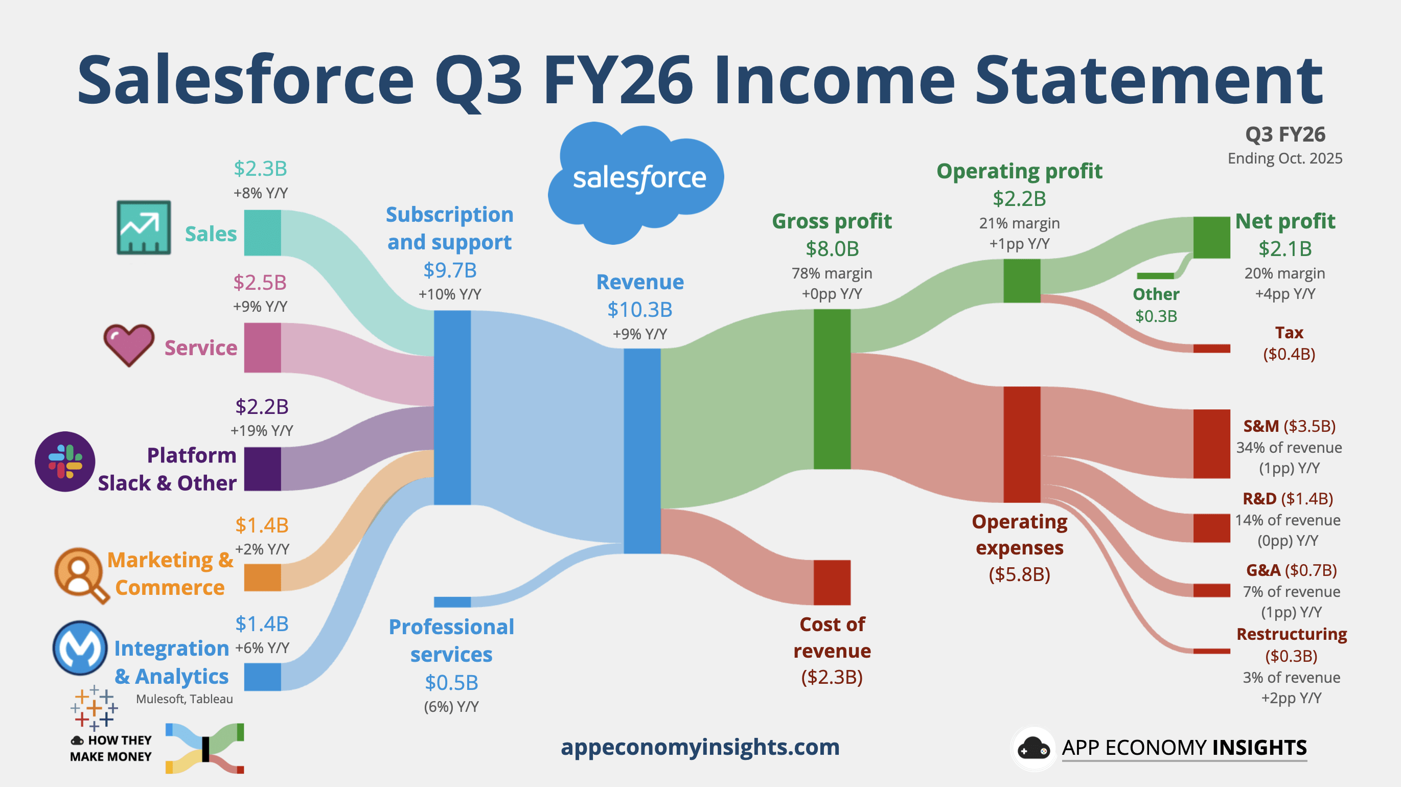 Salesforce posted a solid but unspectacular quarter on the surface, but under the hood, the engine is shifting gears. Revenue grew 9% Y/Y to $10.3 billion (in-line), and non-GAAP EPS landed at $3.25 ($0.39 beat).