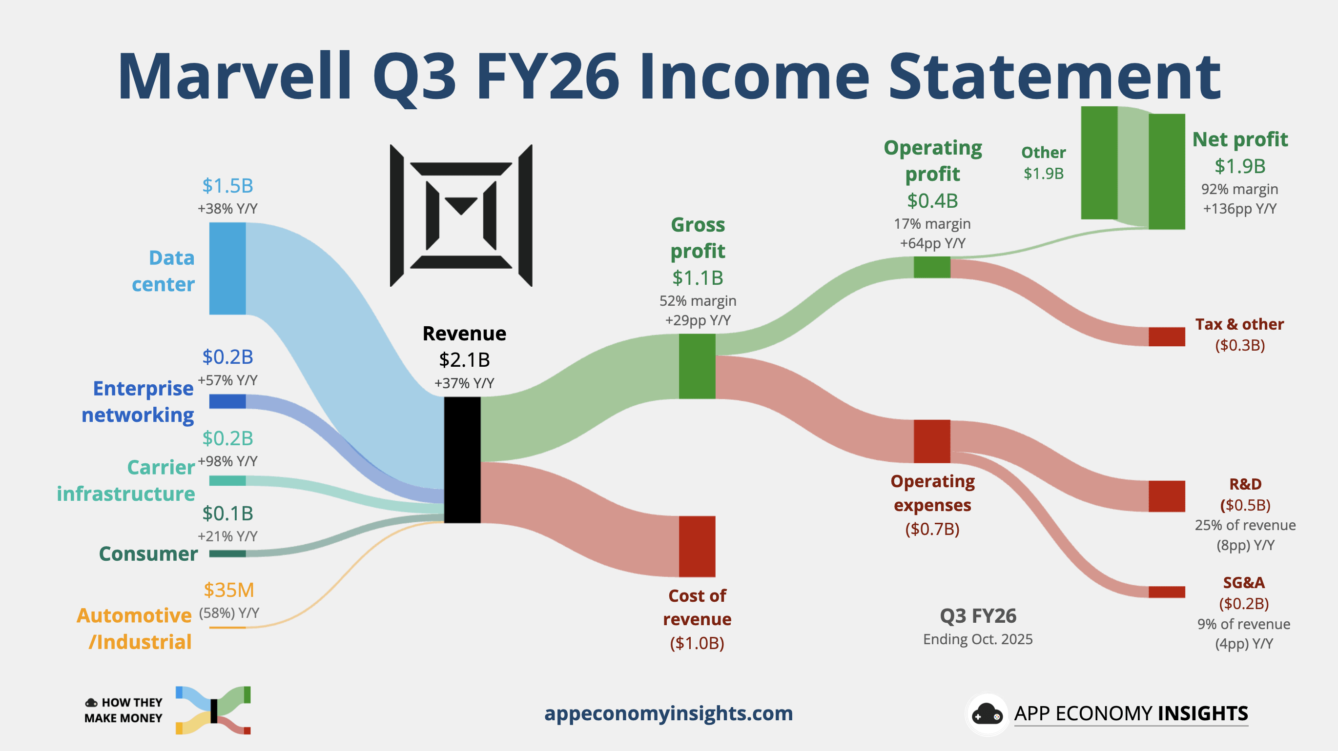 Marvell’s Q3 FY26 (October quarter) was all about the pivot to AI infrastructure. The company has effectively transformed from a cyclical semiconductor maker into a pure-play AI bet.