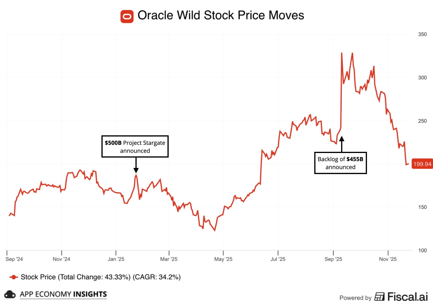 Oracle’s stock price doubled from January to September, driven by the sheer scale of these AI commitments. Now the stock has fallen back to earth (down more than 40% in the past two months) as the market questions how much of this will convert, and how quickly.